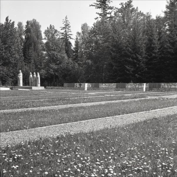 2. Pasaules kara upuru kapi Spārītes parkā: Piemineklis – četras cilvēku skultūrpas (karavīrs un trīs sievietes). Redzams laukums pie pieminekļa, koki, apstādījumi