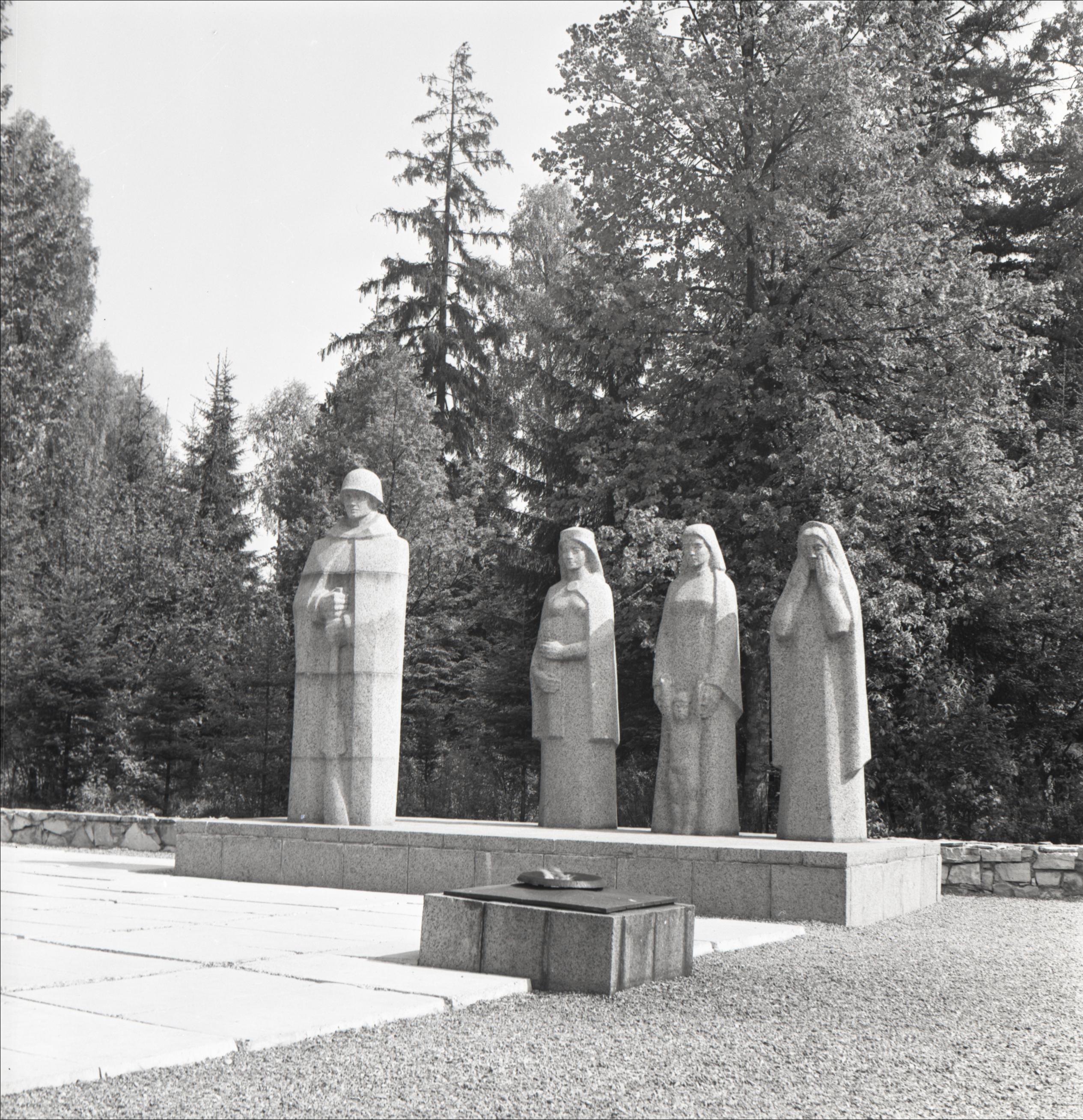 2. Pasaules kara upuru kapi Spārītes parkā: Piemineklis – četras cilvēku skultūrpas (karavīrs un trīs sievietes). Redzams laukums pie pieminekļa, koki, apstādījumi, mūžīgā uguns