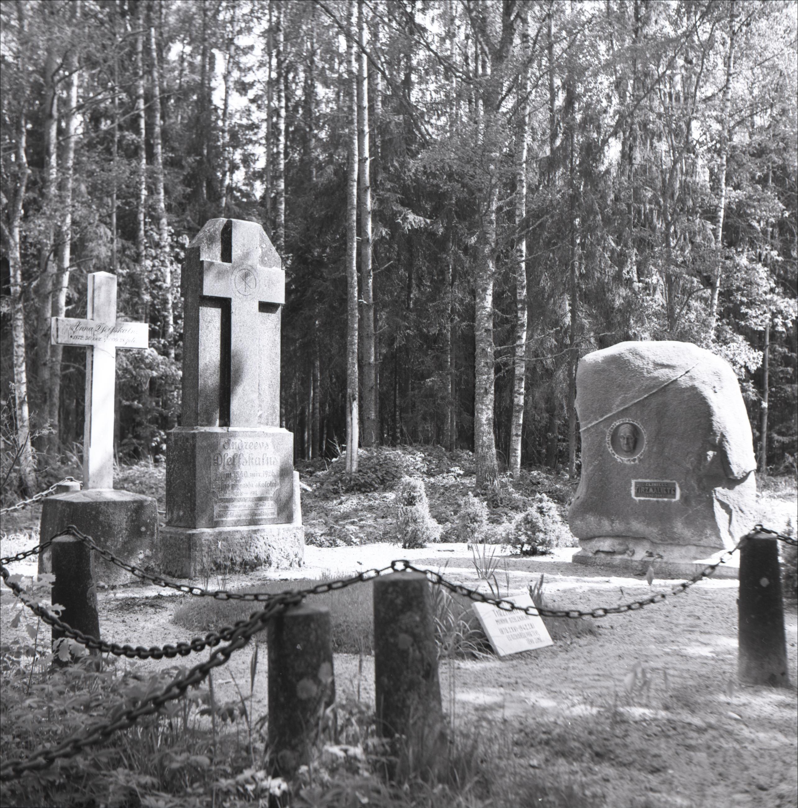 Dzejnieces Tirzmalietes kaps: Vairāki kapa pieminekļi, apstādījumi, koki, metāla ķēdes iežogojums