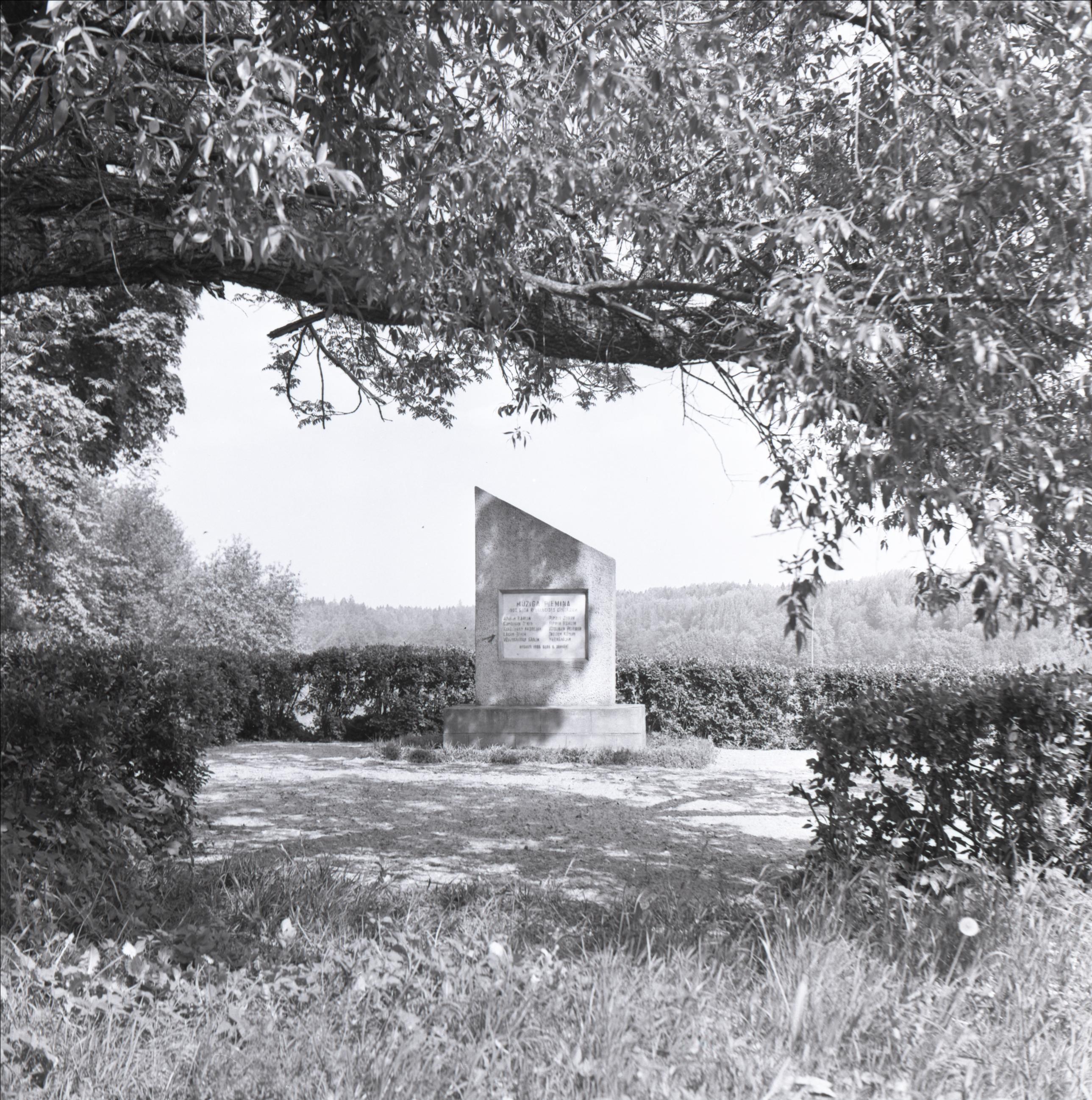 Vieta, kur 1906. gadā tika nošauti 10 revolucionāri: Piemineklis, tam apkārt apstādījumi un dzīvžogs, priekšplānā koks