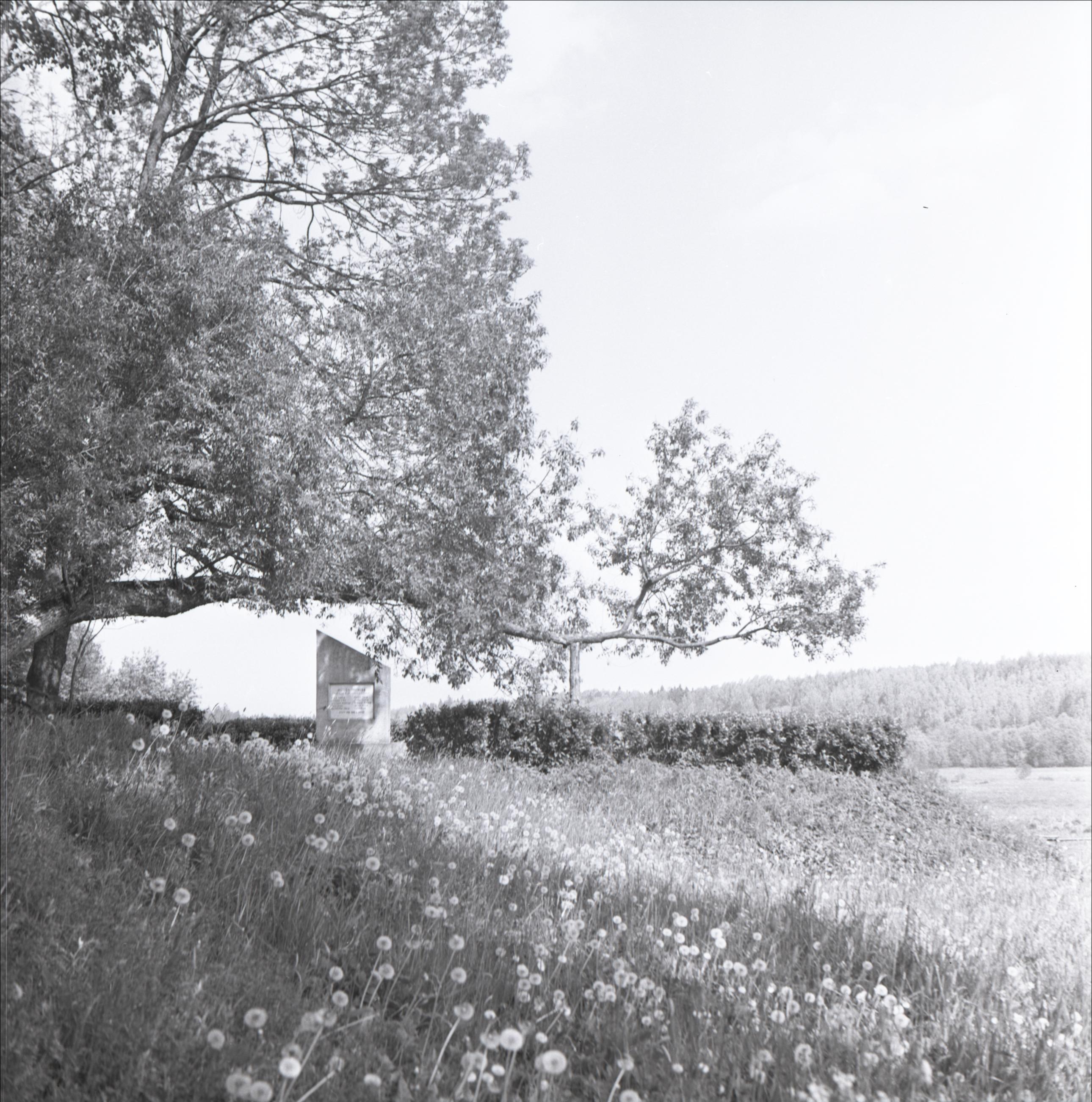 Vieta, kur 1906. gadā tika nošauti 10 revolucionāri: Piemineklis, tam apkārt dzīvžogs, priekšplānā koks un pļava