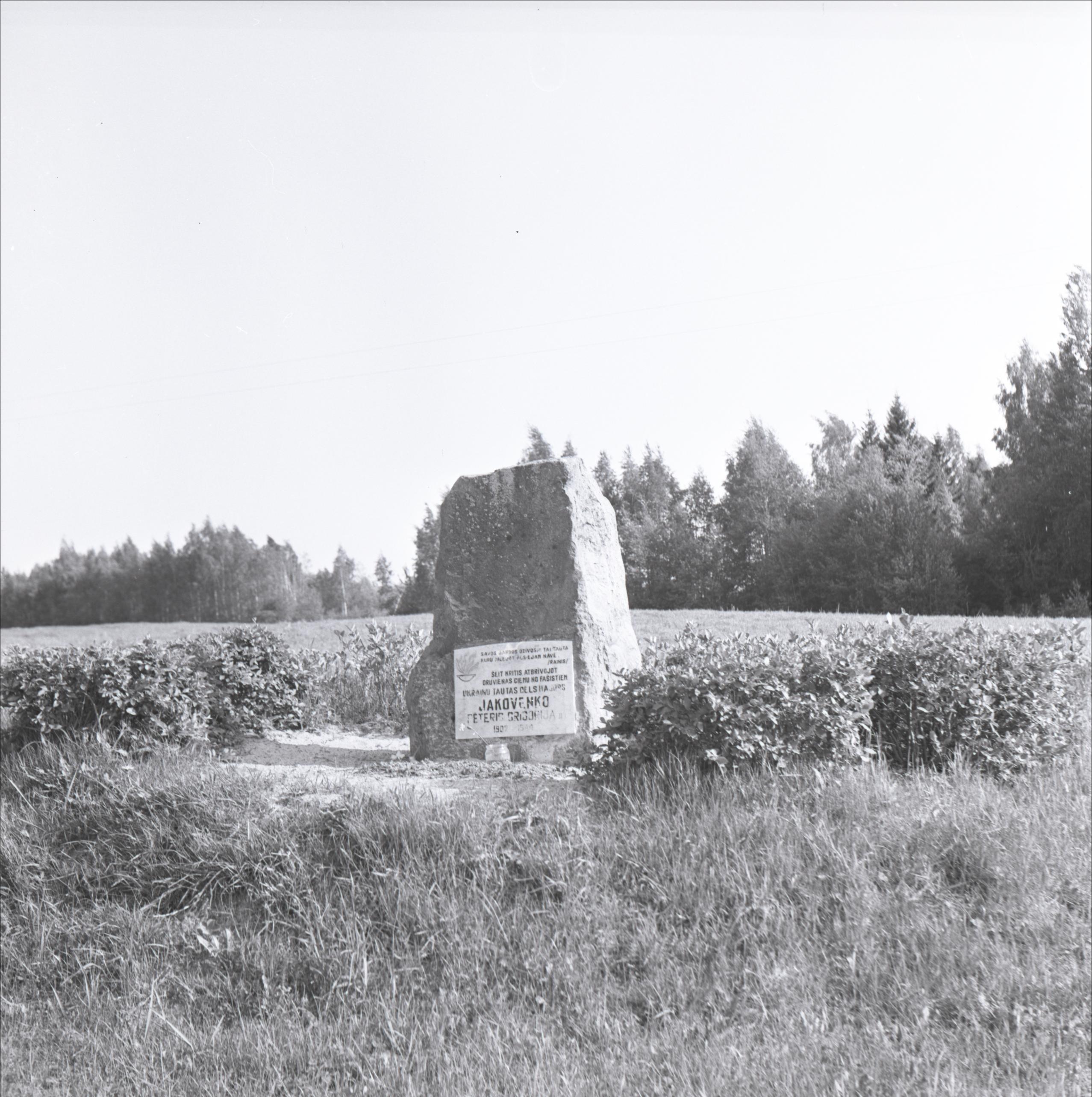 Vieta, kur 1944. gadā kritis Pēteris Jakovenko: Piemineklis, apstādījumi, fonā pļava, mežs