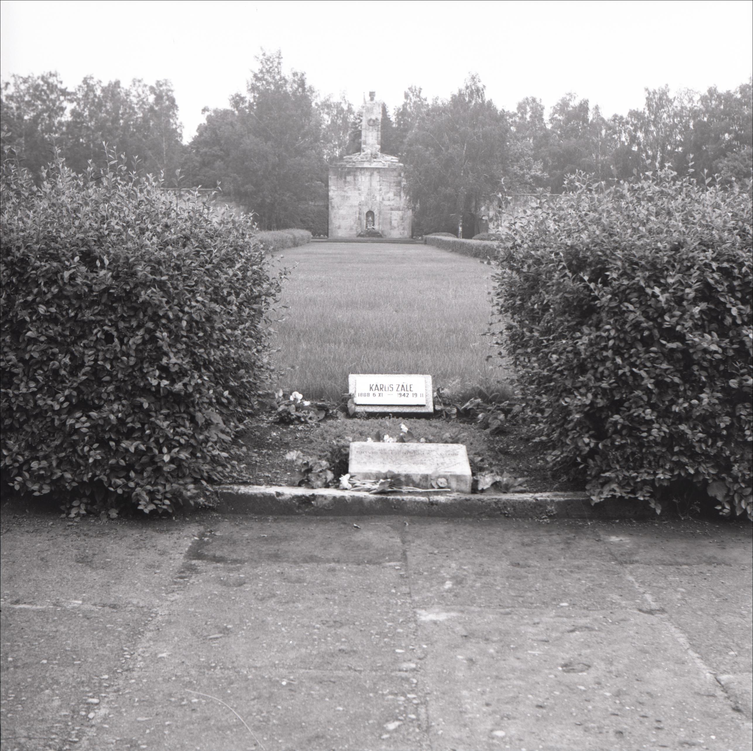 Brāļu kapi: Kārļa Zāles kaps, fonā Brāļu kapu ansamblis, apstādījumi
