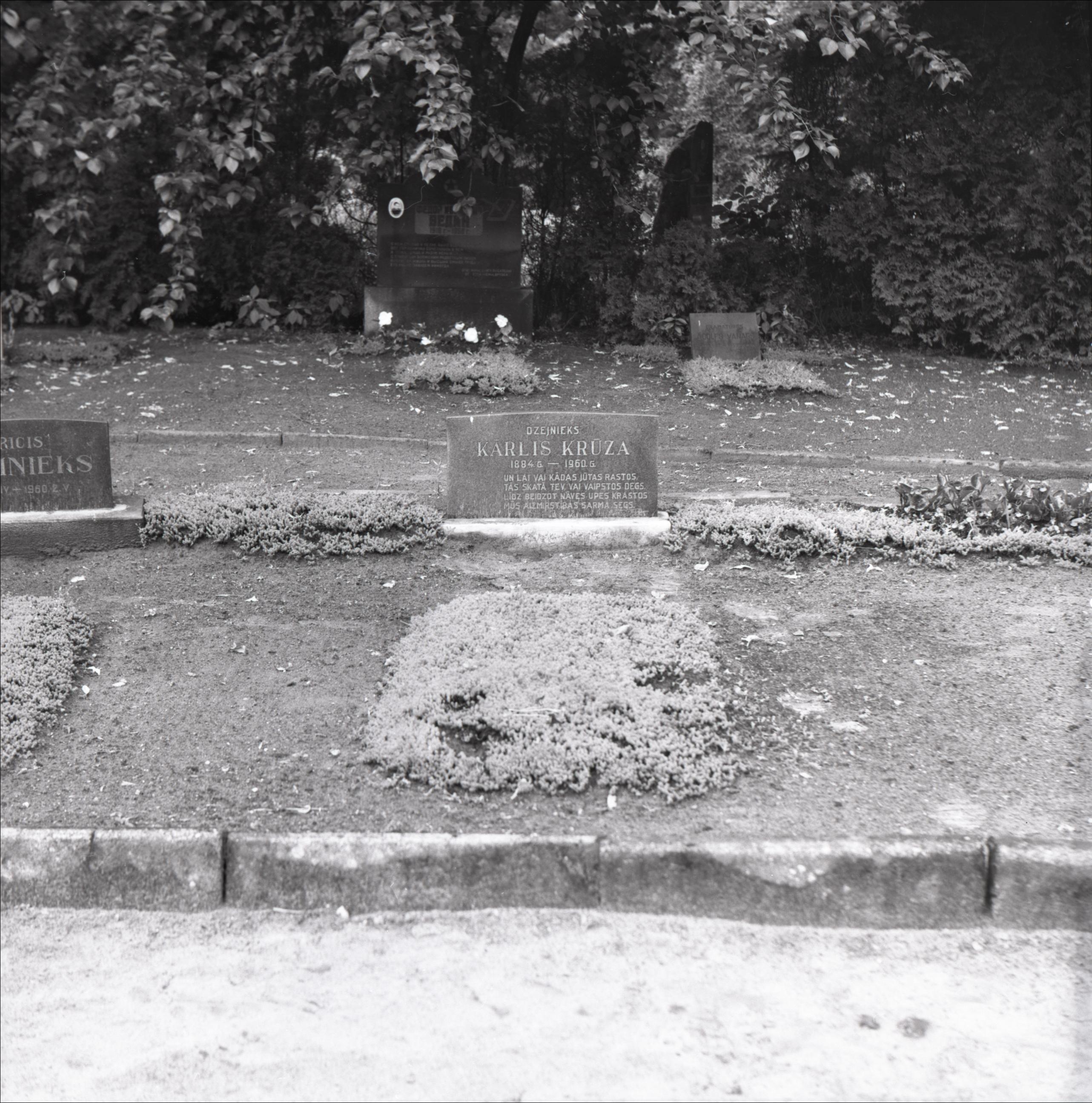 Raiņa kapu ansamblis t. sk. vārti, administratīvā ēka, kapliča, krematorija: Kārļa Krūzes kaps – kapa plāksne ar iegravētu tekstu un dzejoli, apstādījumi