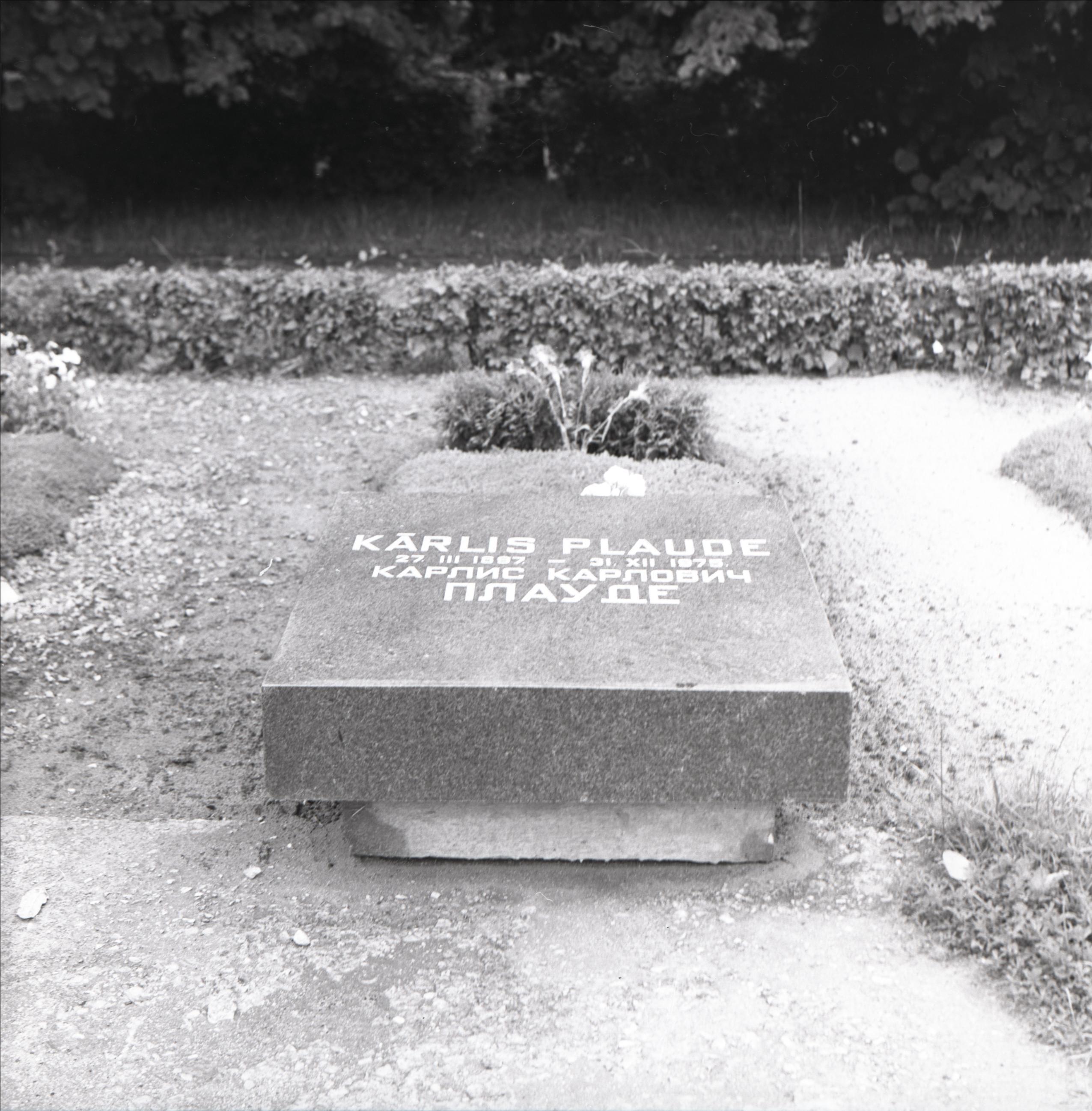 Raiņa kapu ansamblis t. sk. vārti, administratīvā ēka, kapliča, krematorija: Kārļa Plaudes kaps – kapa plāksne, apstādījumi