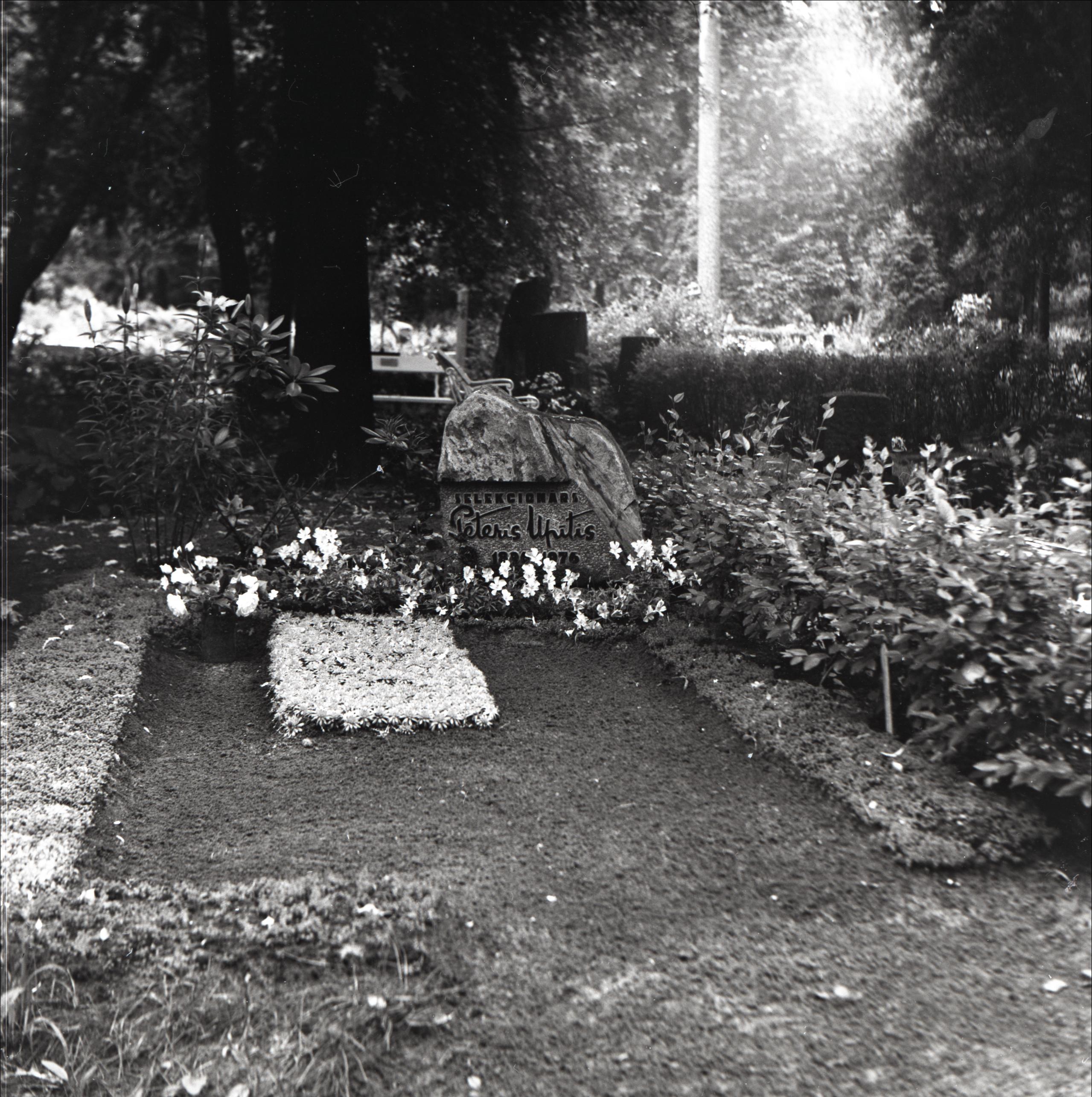 Raiņa kapu ansamblis t. sk. vārti, administratīvā ēka, kapliča, krematorija: Pētera Upīša kaps – kapakmens, apstādījumi, krūmi, fonā koki un citas kapavietas