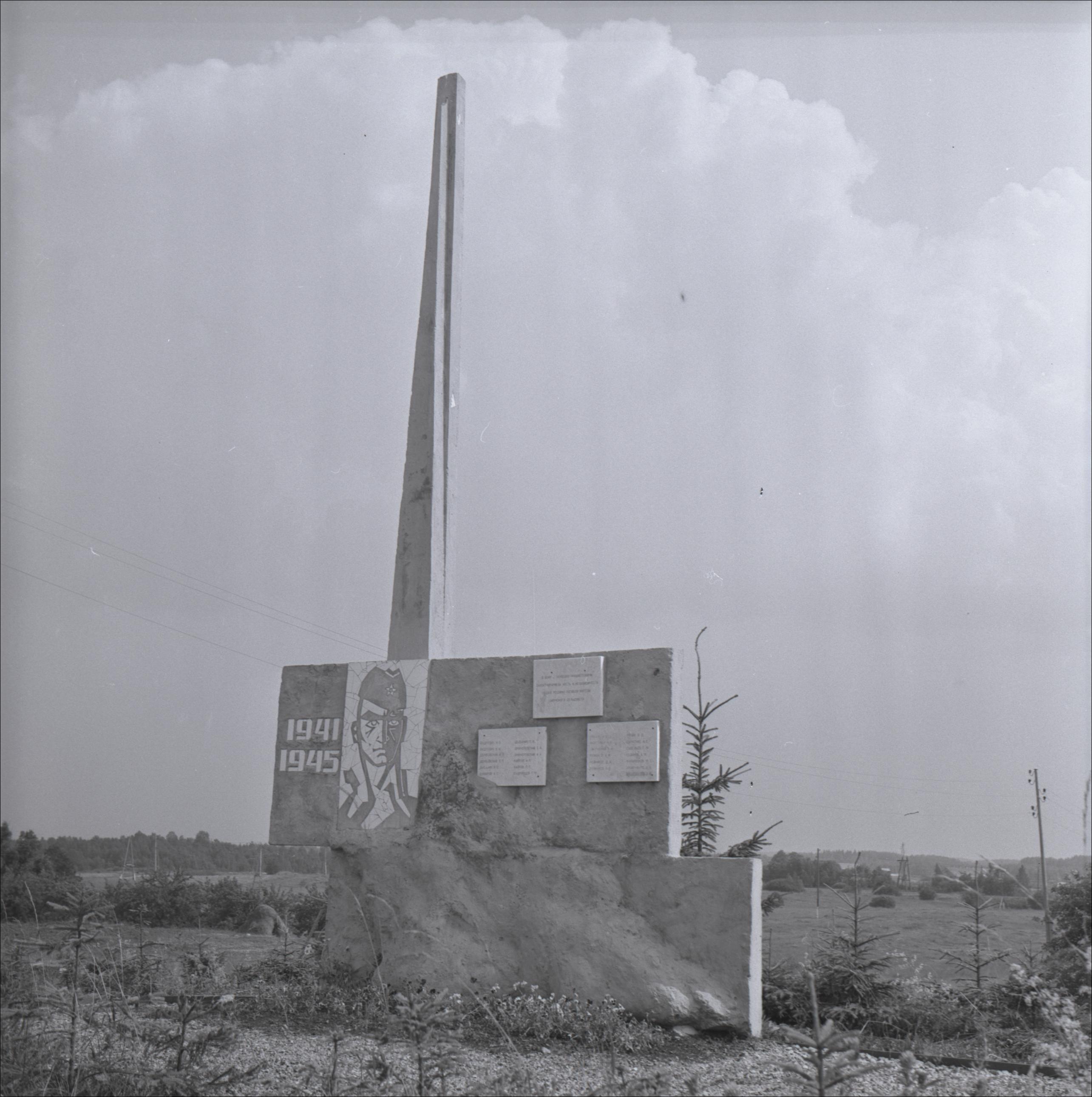 Piemineklis 2. Pasaules karā kritušajiem ciema iedzīvotājiem: Piemineklis ar obelisku, plāksnes ar tekstiem, karavīra portrets un gadskaitļi "1941 1945"
