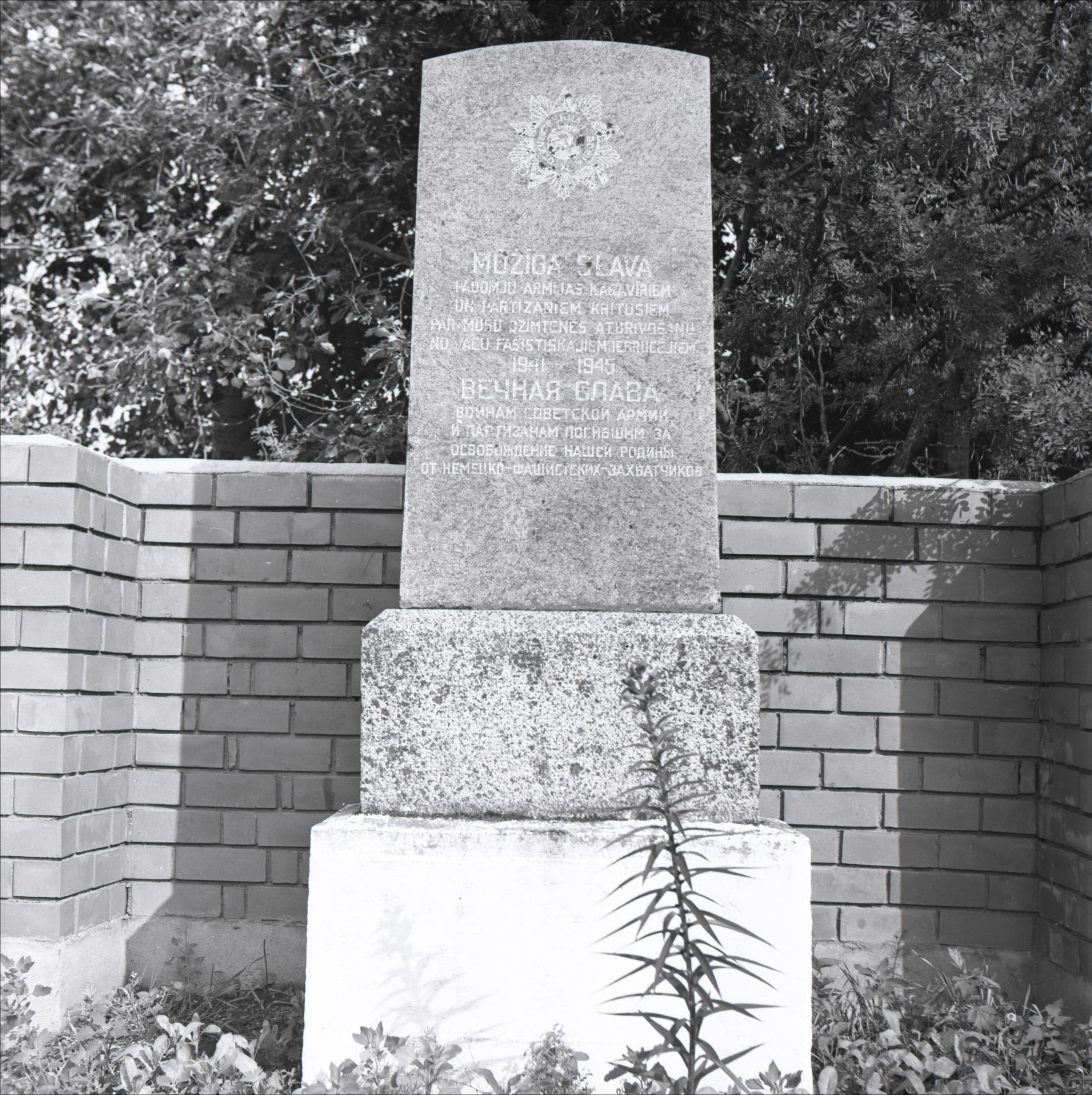 2. Pasaules karā kritušo kapi: Obelisks ar iegravētu tekstu, fonā no ķieģeļiem veidots mūris