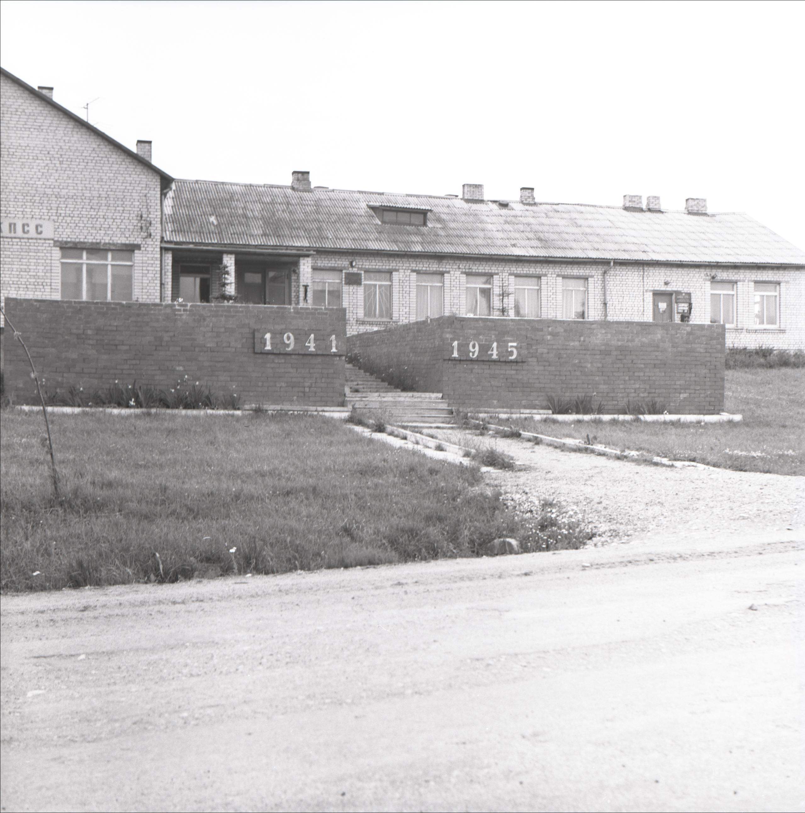 Piemineklis 2. Pasaules karā kritušajiem ciema iedzīvotājiem: Uz ķieģeļu mūra piestiprināti gadskaitļi "1941 – 1945", cauri mūrim kāpnes, kas ved uz ķieģeļu vienstāvu ēku