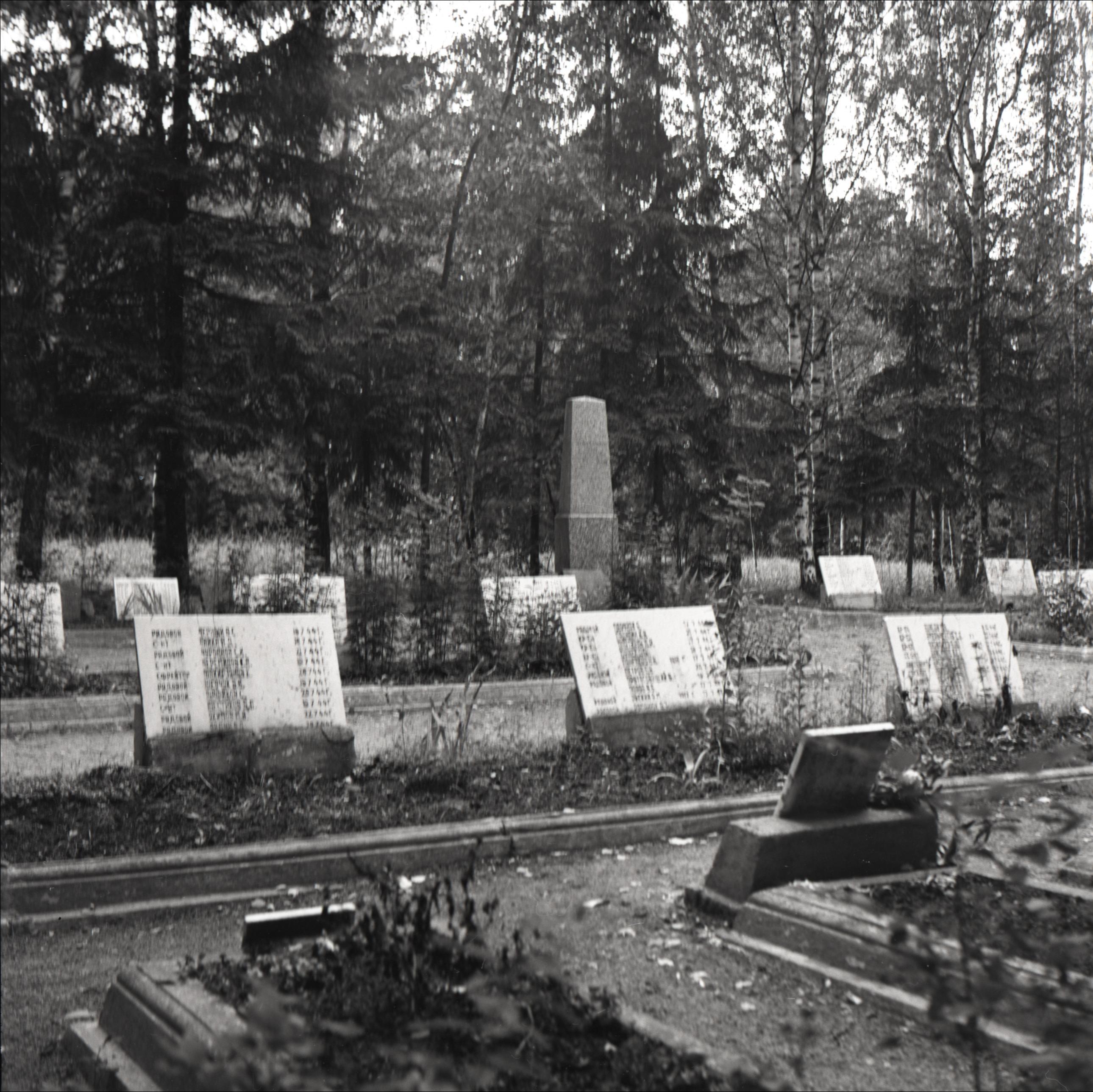 2. Pasaules karā kritušo kapi: Obelisks, kapa plāksnes ar kritušo vārdiem, apstādījumi, fonā koki