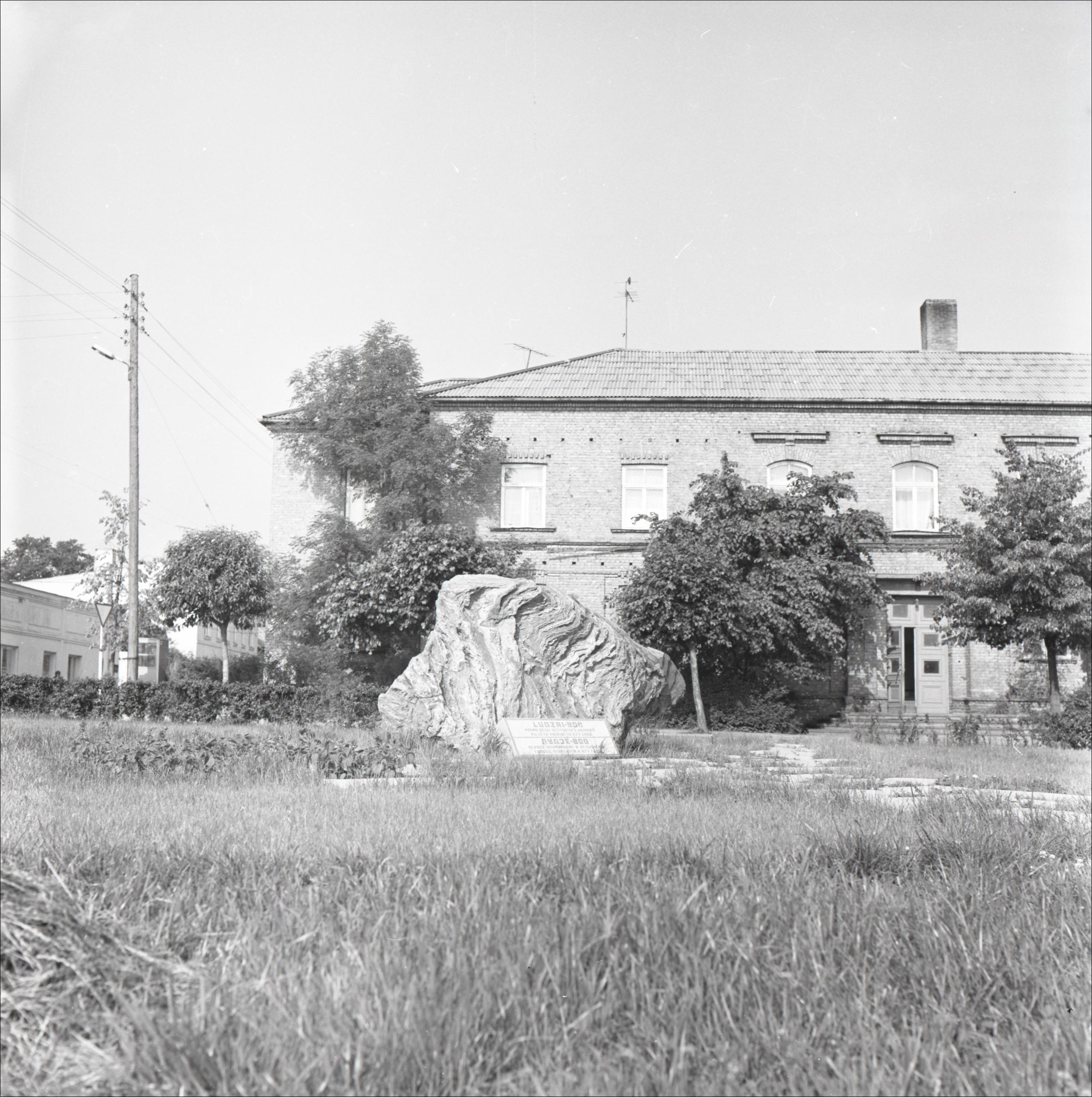 Akmens Ludzas 800 gadu jubilejai: Akmens, fonā divstāvu dzīvojamā ēka, koki