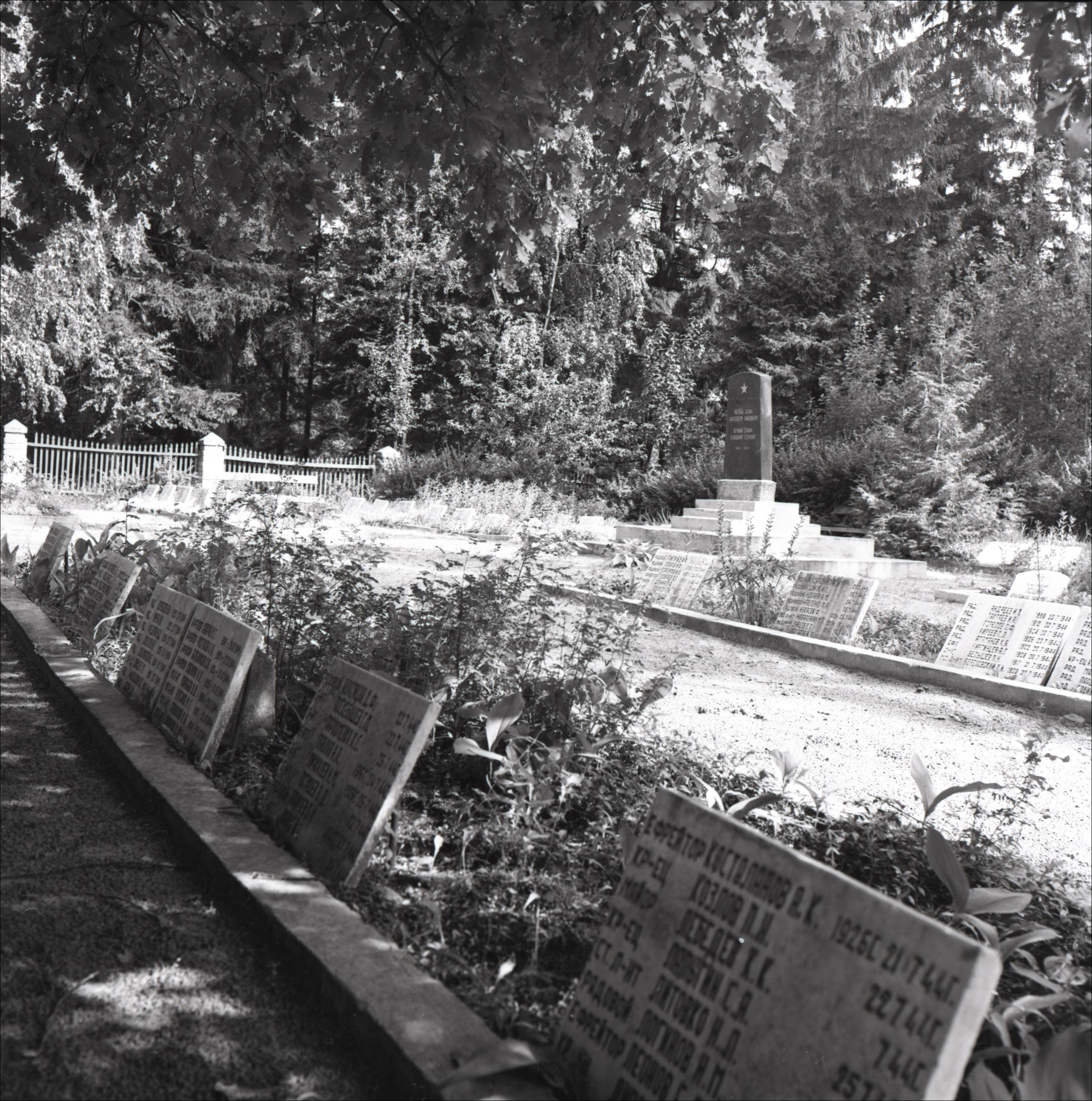2. Pasaules karā kritušo kapi: Kopskats – piemiņas plāksnes vairākās rindās, fonā obelisks