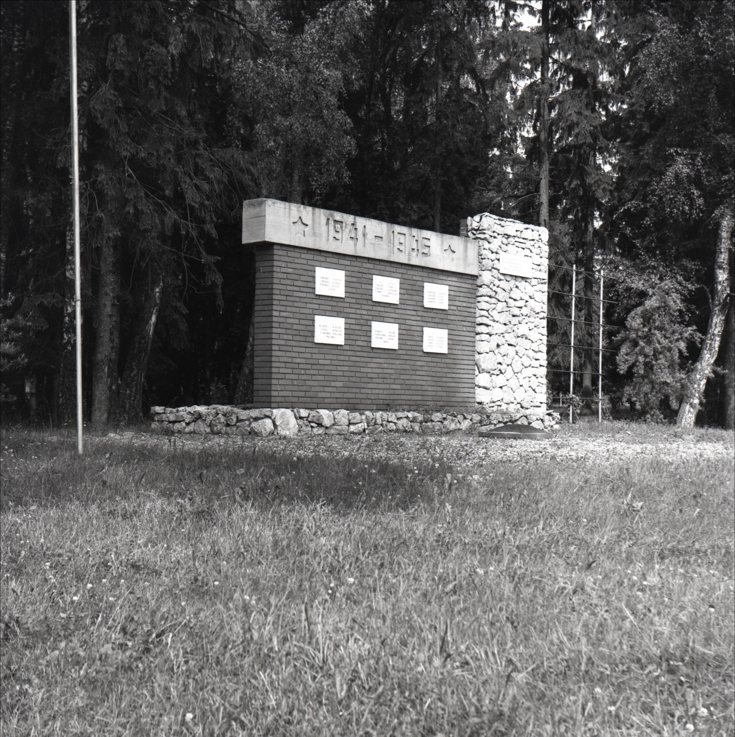 Piemineklis 2. Pasaules karā kritušajiem ciema iedzīvotājiem: Ķieģeļu un akmeņu siena, uz kuras iegravēta zvaigzne, gadskaitļi "1941 – 1945" un plāksnes ar kritušo vārdiem, fonā koki