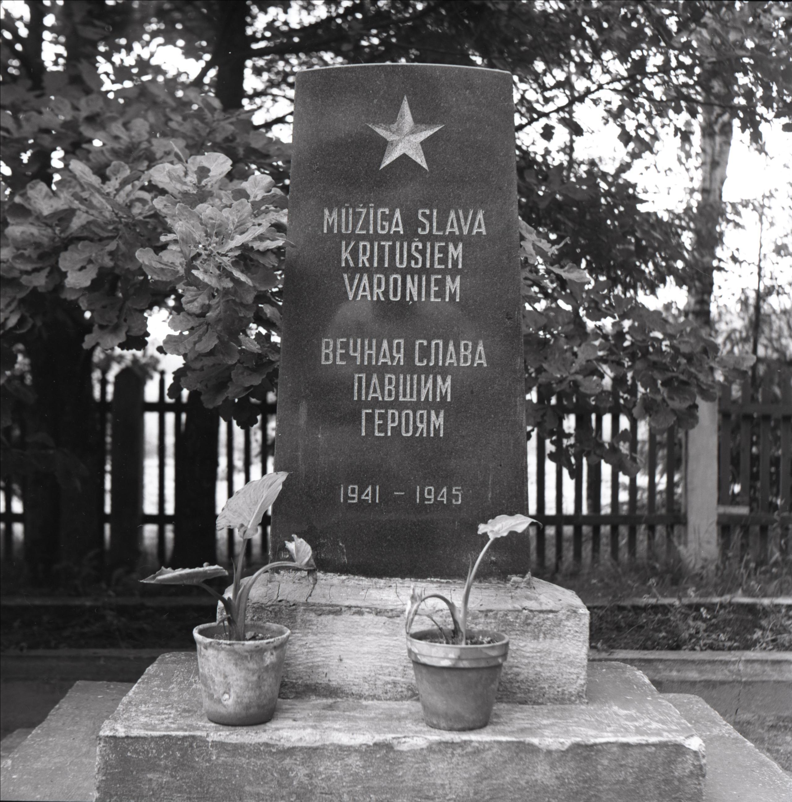 2. Pasaules karā kritušo kapi: Tuvplāns – piemineklis ar zvaigzni un uzrakstu "Mūžīga slava kritušiem varoņiem"