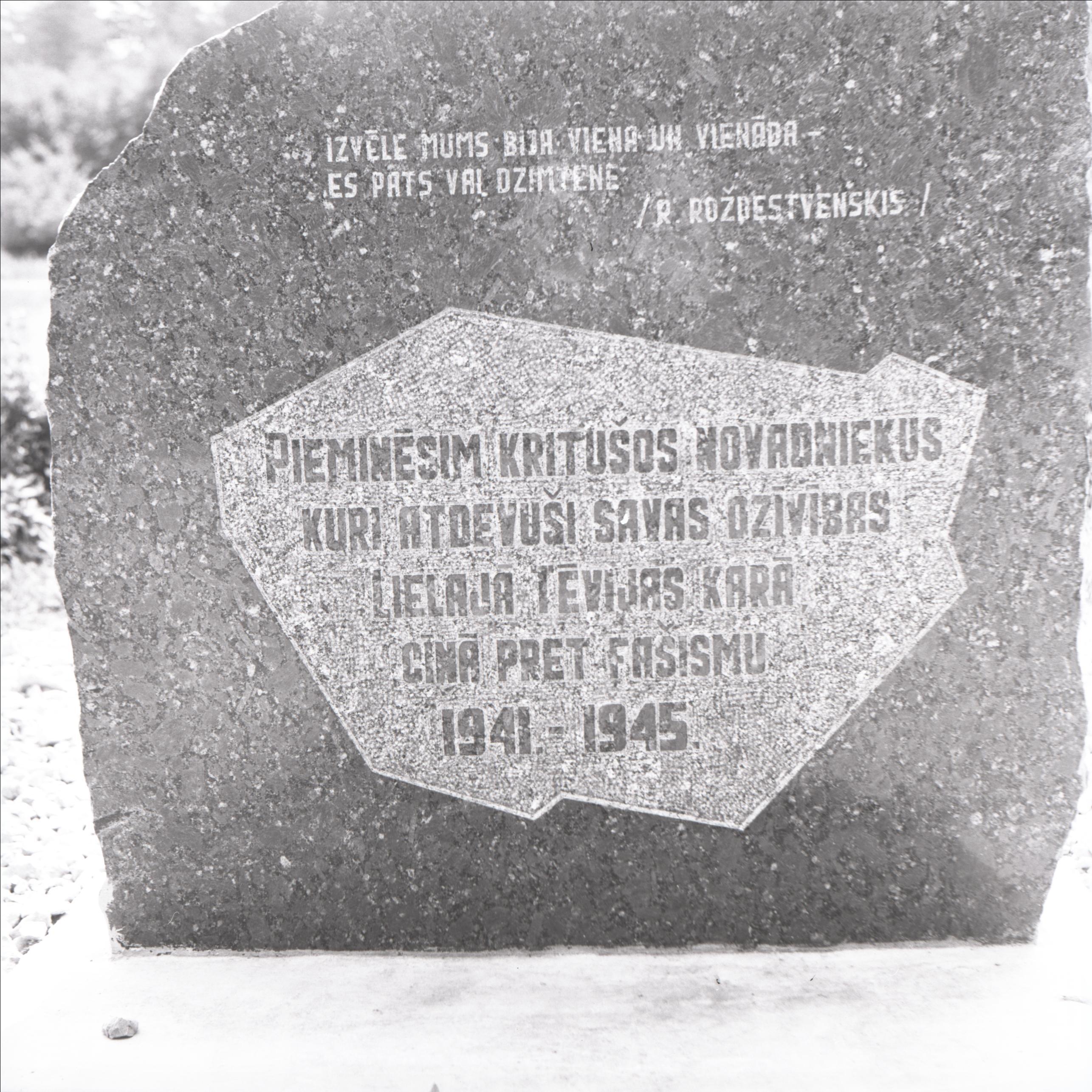 Piemineklis 2. Pasaules karā kritušajiem ciema iedzīvotājiem: Tuvplāns – piemineklis ar iegravētu tekstu