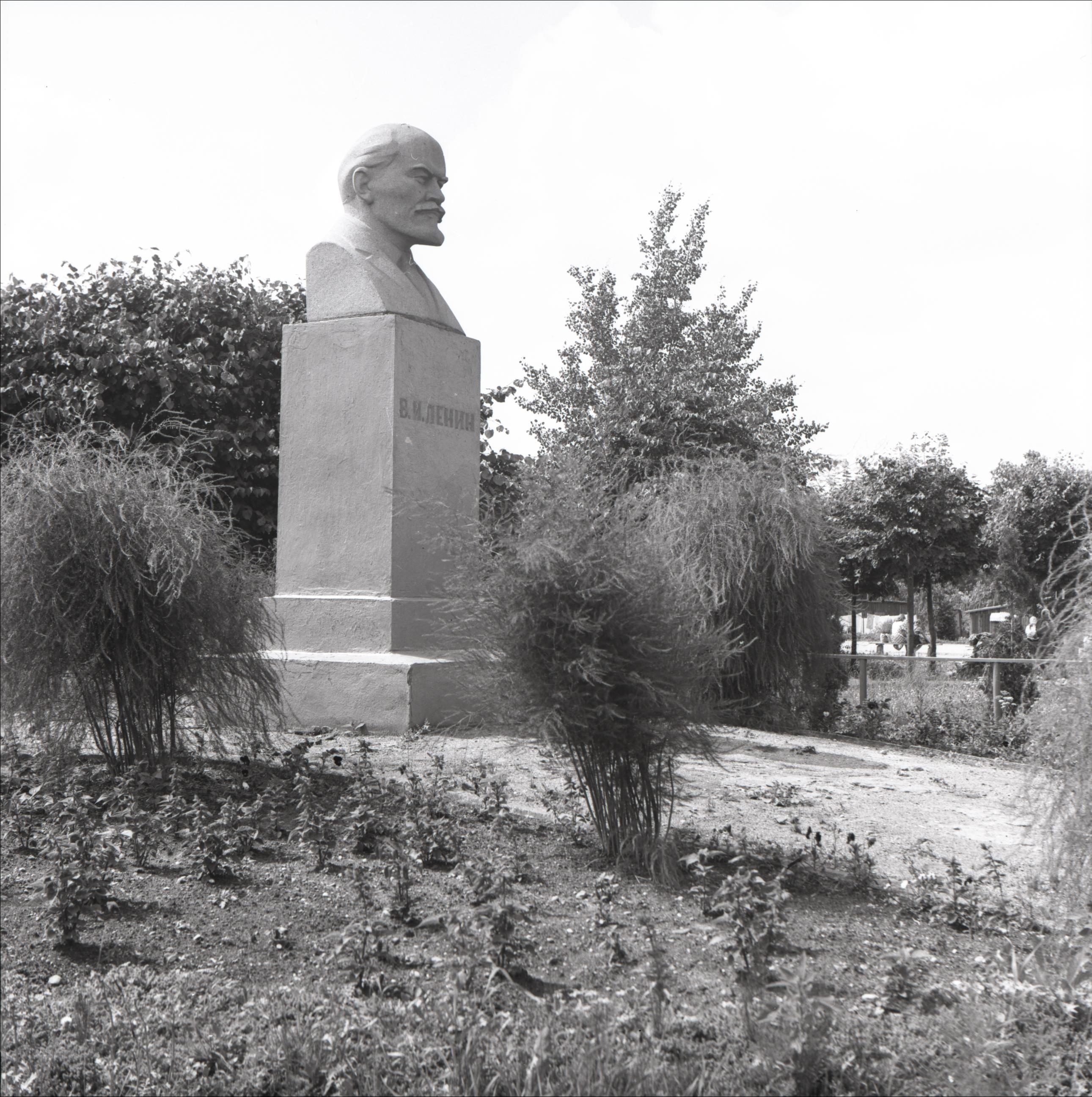 Ļeņina piemineklis: Piemineklis ar skatu no sāna, apkārt koki, krūmi