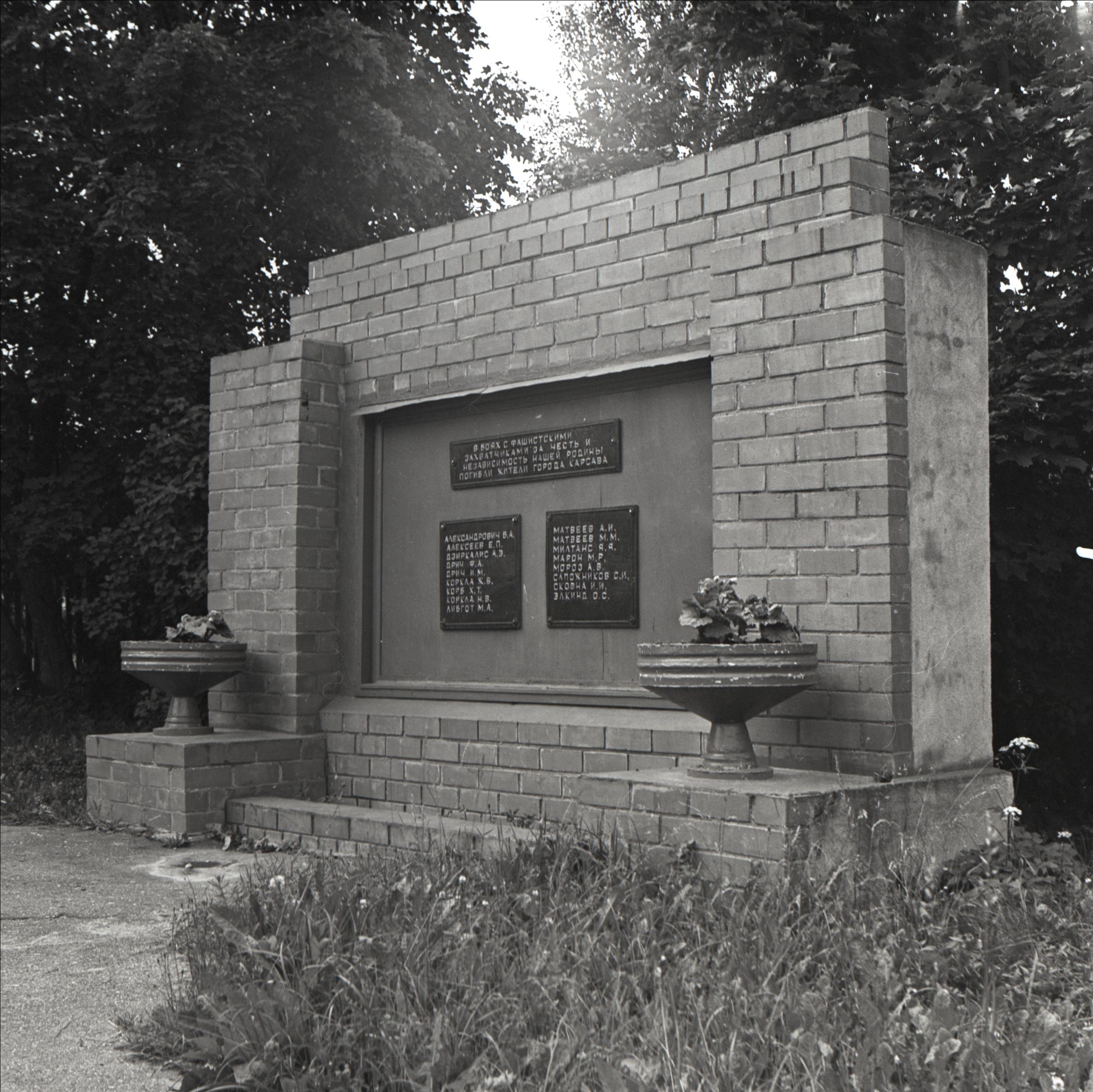 Piemineklis 2. Pasaules karā kritušajiem pilsētas iedzīvotājiem: Ķieģeļu mūris ar piemiņas plāksnēm un kritušo vārdiem uz tām