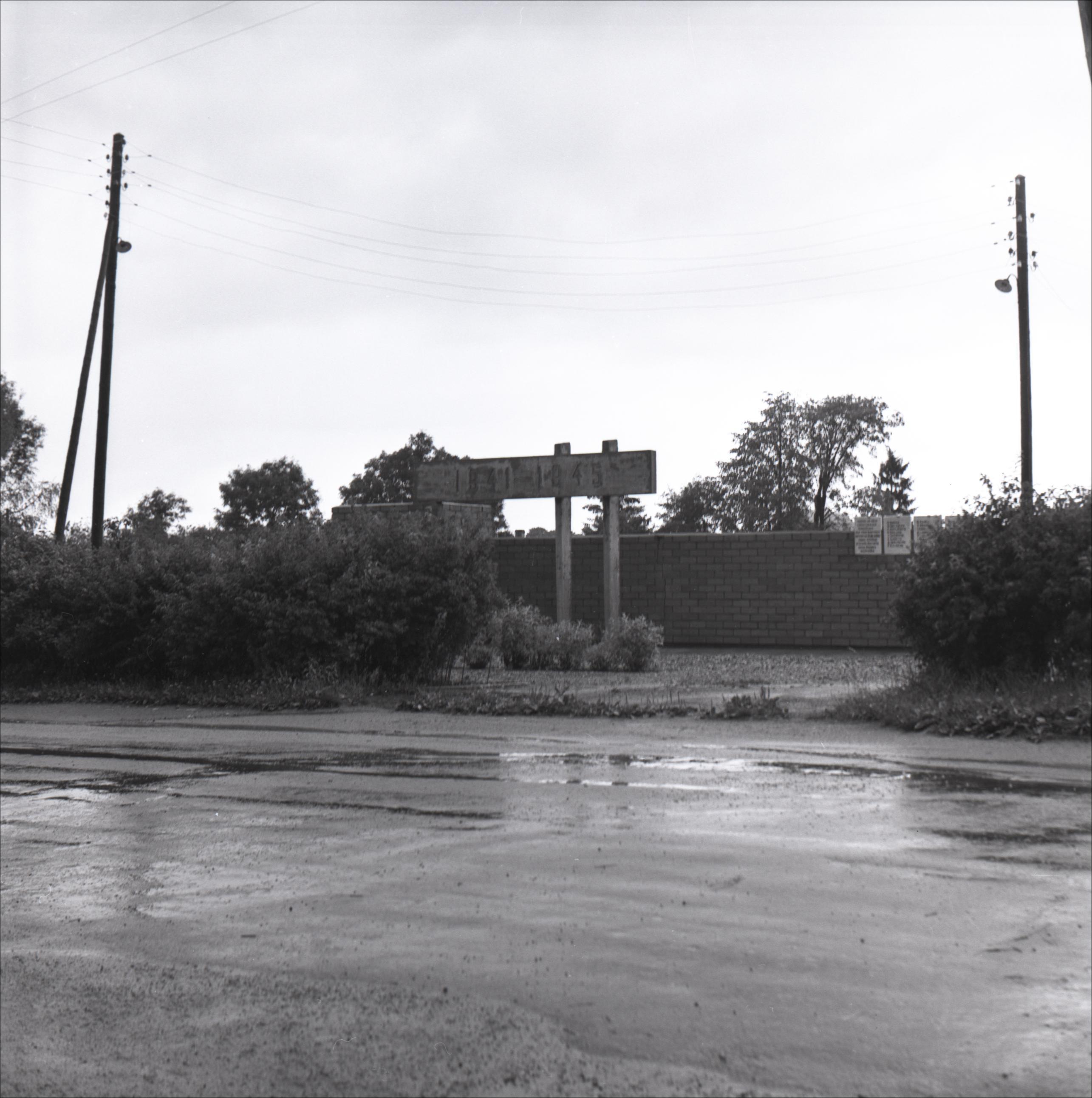 Piemineklis 2. Pasaules karā kritušajiem ciema iedzīvotājiem: Ķieģeļu mūra siena ar četrām piemiņas plāksnēm, uz kurām rakstīti kritušo vārdi, priekšplānā iela un krūmi
