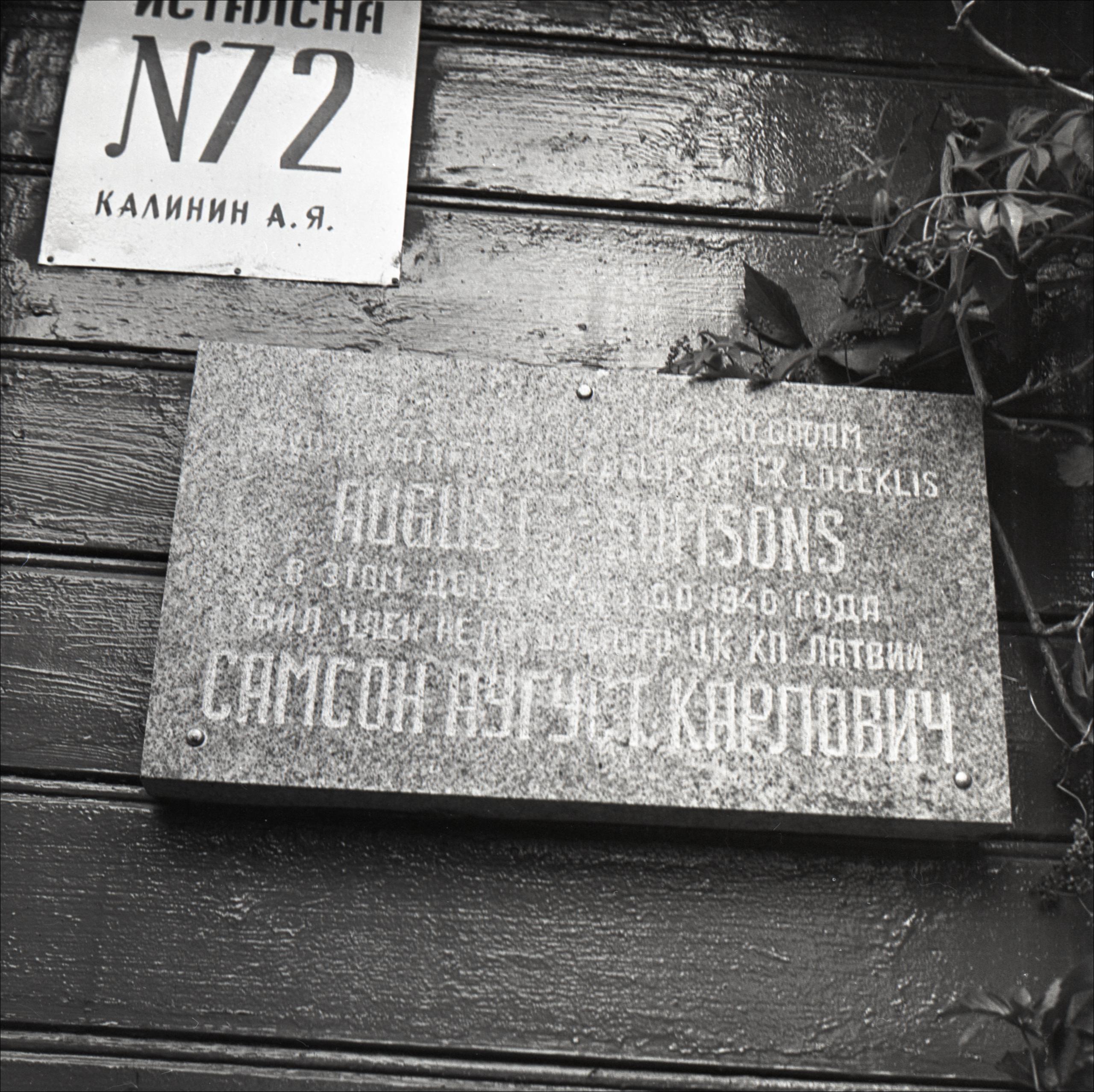 Māja, kurā no 1923. - 1940. gadam dzīvoja A. Samsons: Plāksne pie mājas fasādes