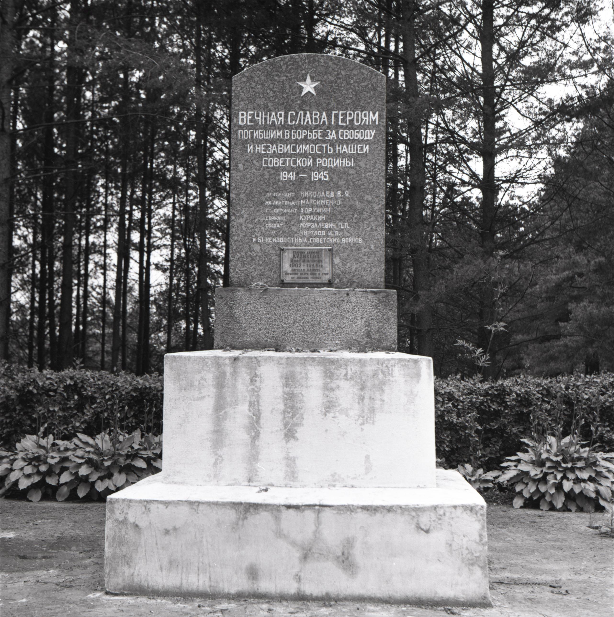2. Pasaules karā kritušo kapi: Piemineklis uz postamenta, fonā apstādījumi, dzīvžogs, koki