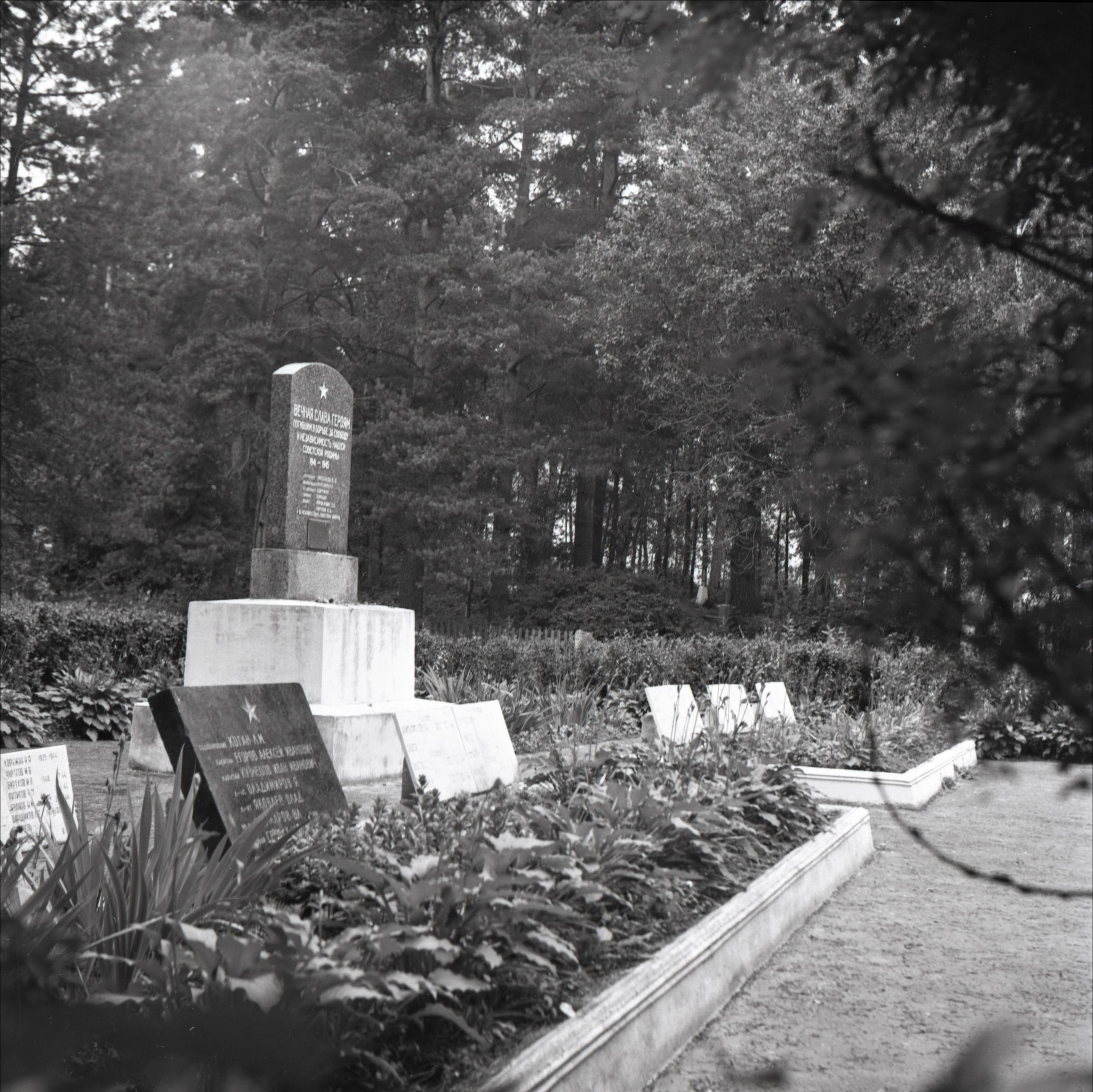 2. Pasaules karā kritušo kapi: Piemineklis uz postamenta, piemiņas plāksnes rindās, fonā apstādījumi, dzīvžogs, koki