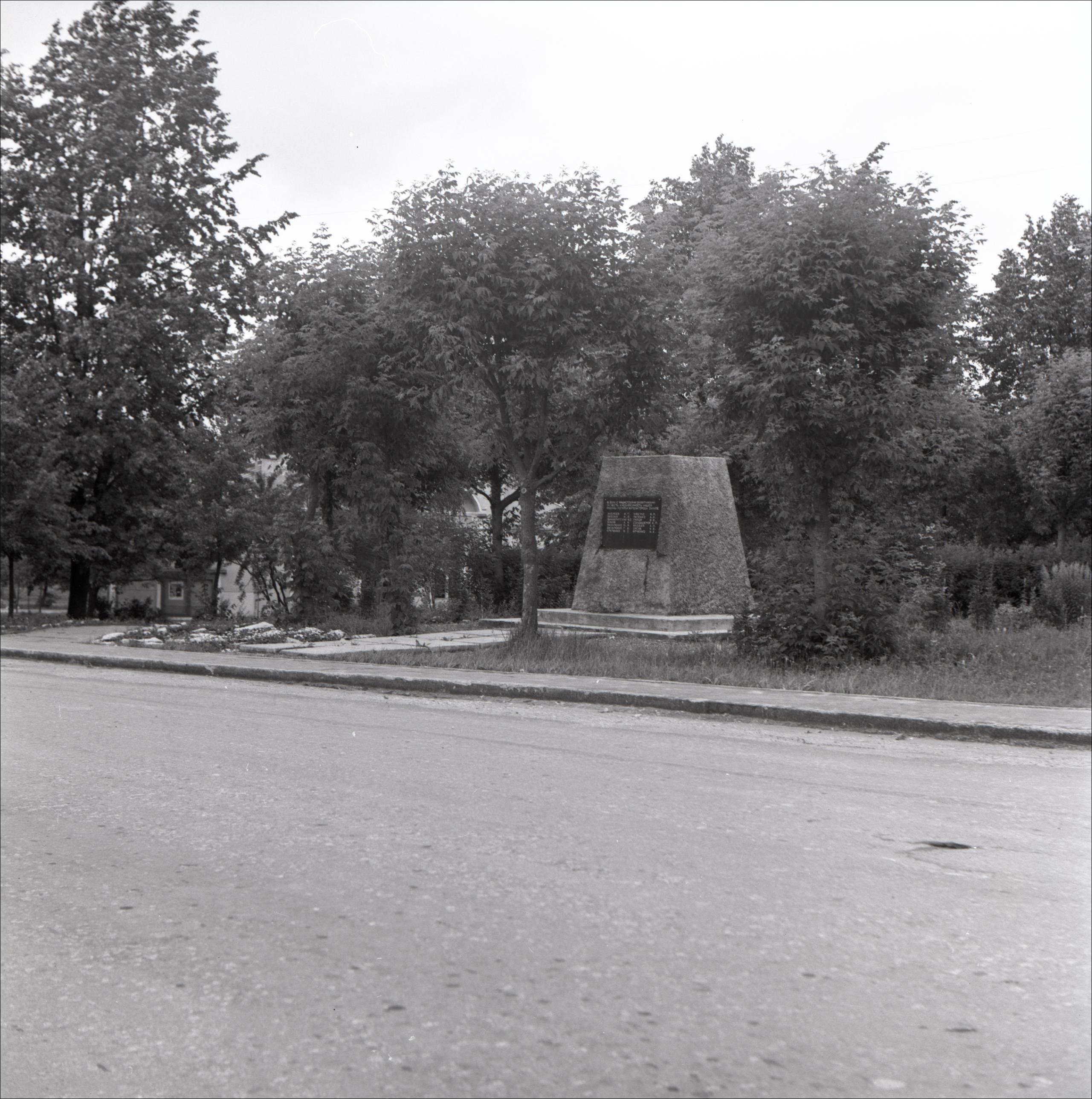 Piemineklis 2. Pasaules karā kritušajiem pilsētas iedzīvotājiem: Obelisks ar piemiņas plāksni, redzama iela, koki