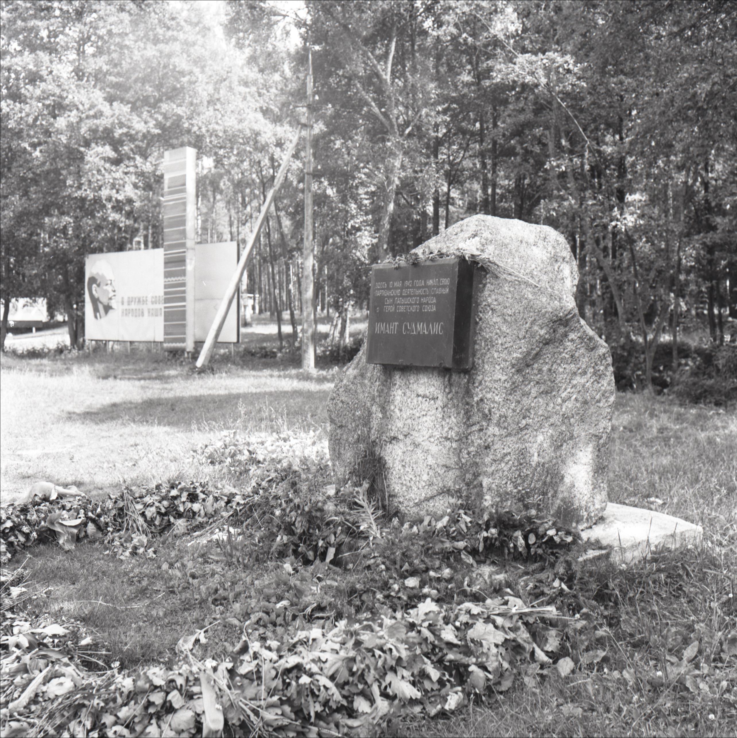 Piemiņas akmens Imantam Sudmalim: Akmens, uz tā plāksne, fonā koki, uz izkārtnes uzzīmēts Ļeņina portrets