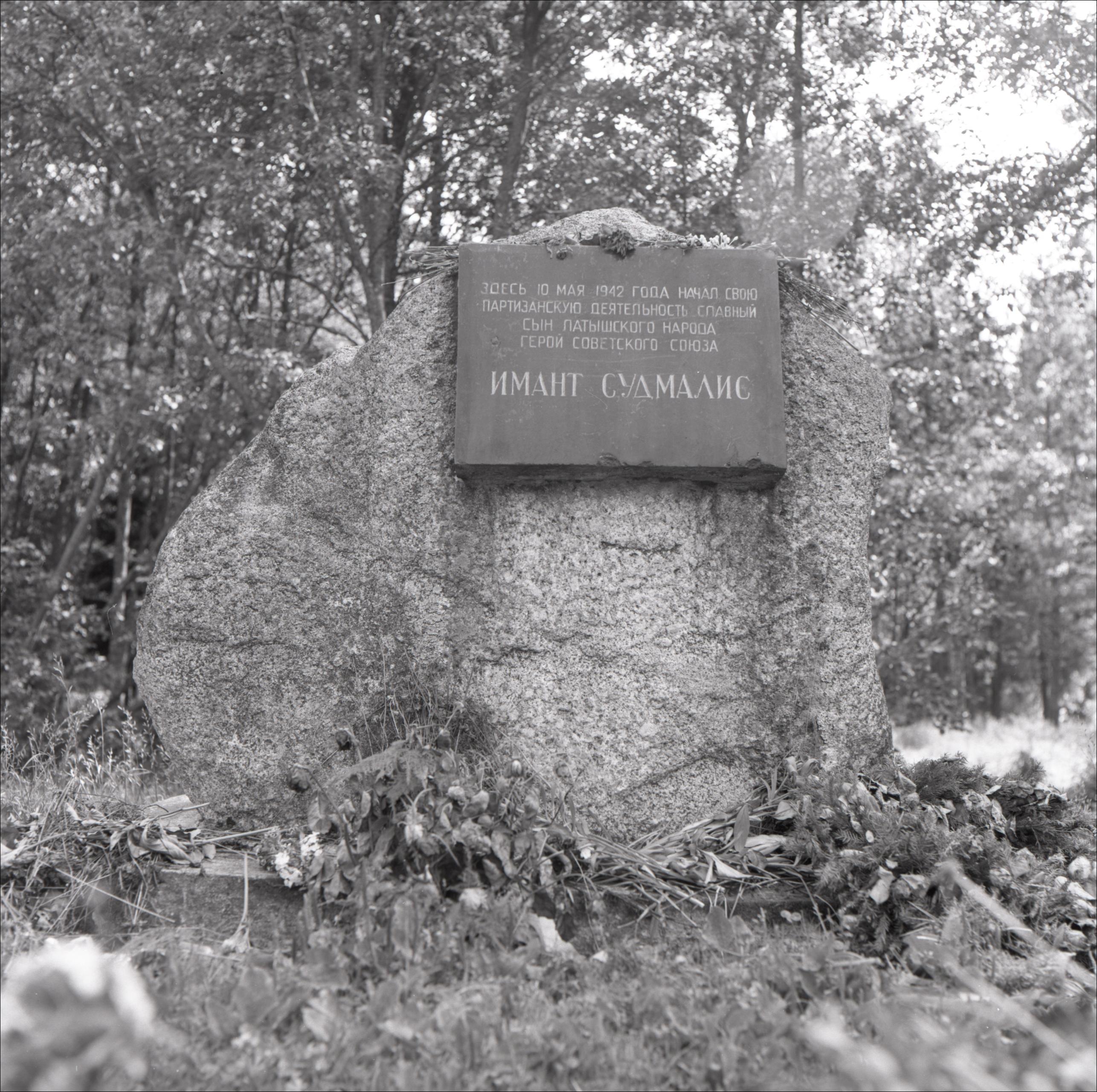 Piemiņas akmens Imantam Sudmalim: Akmens, uz tā plāksne, fonā koki
