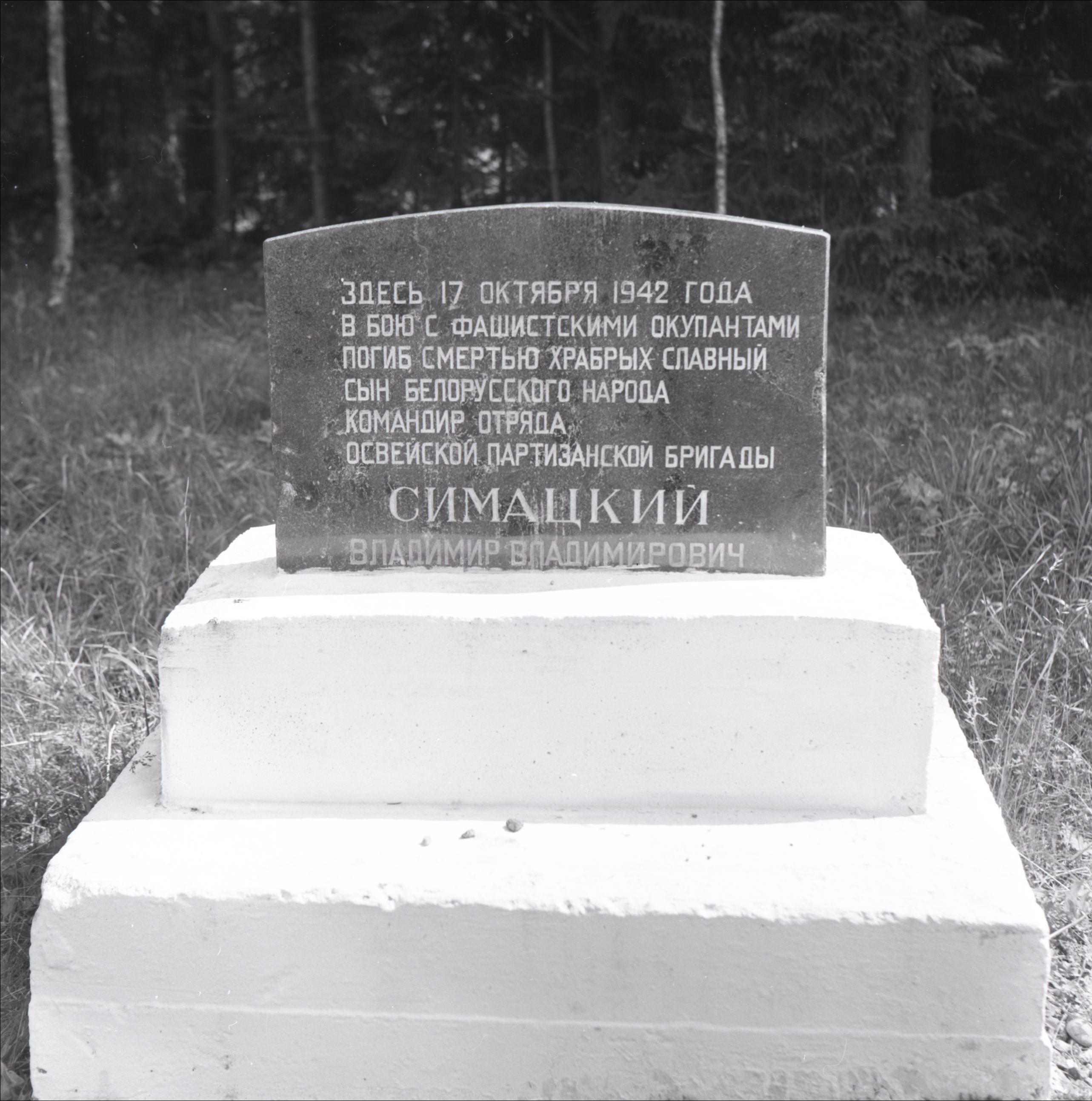 Vladimira Simacka bojāejas vieta: Piemineklis uz paaugstinājuma, fonā mežs