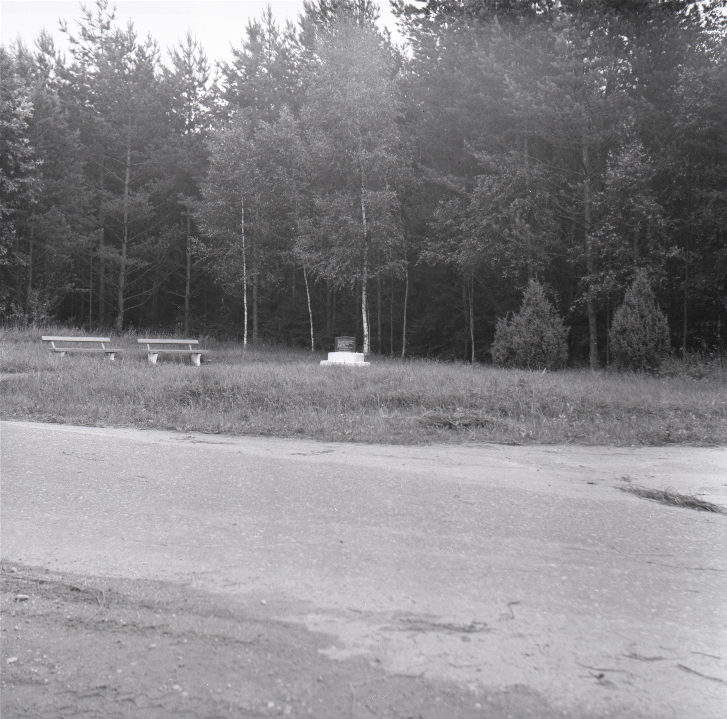 Vladimira Simacka bojāejas vieta: Piemineklis uz paaugstinājuma, fonā mežs, ceļš, soliņi pie tā
