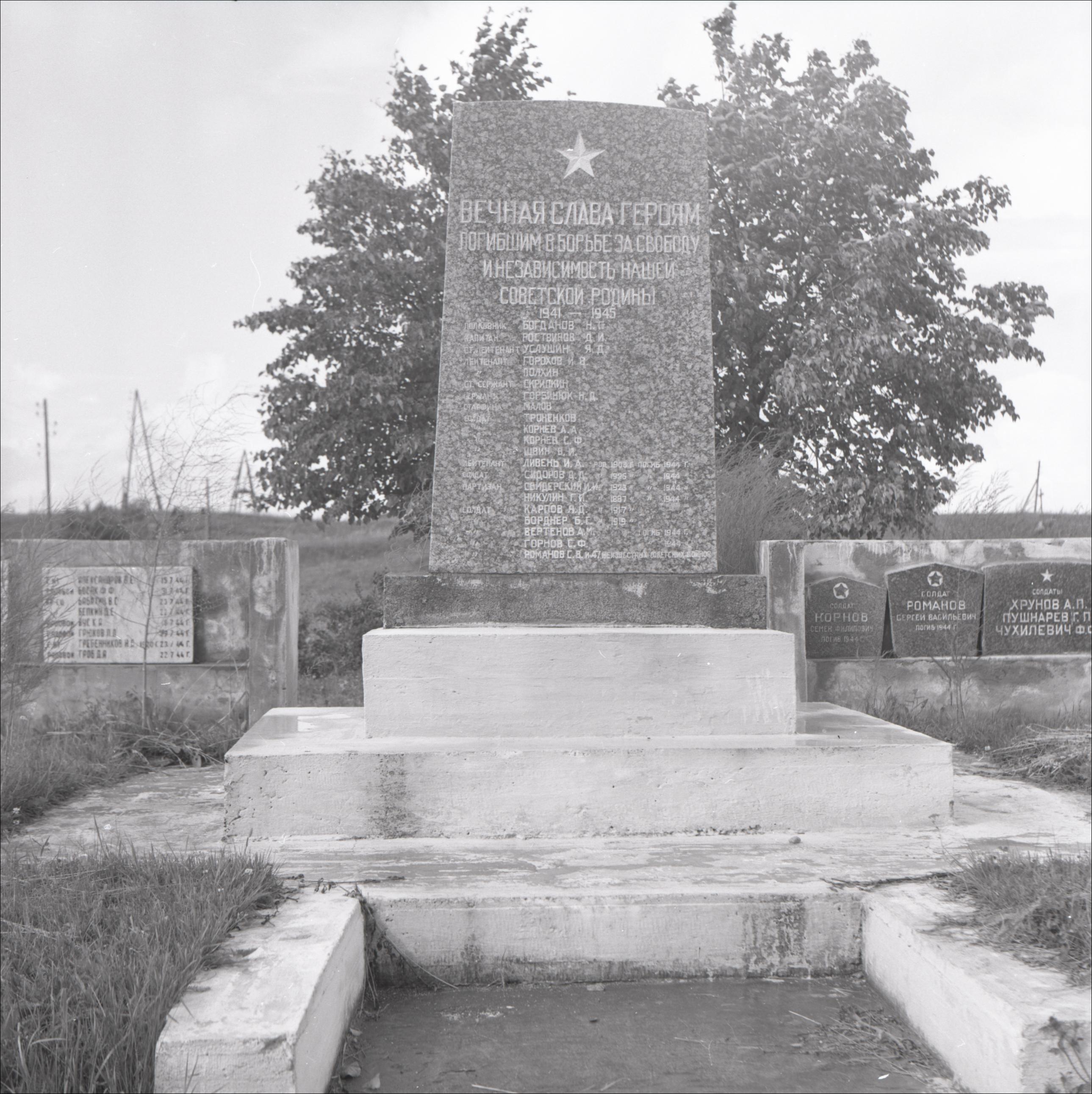 2. pasaules karā kritušo kapi: Piemineklis uz paaugstinajuma, fonā plāksne, pieminekļi