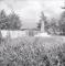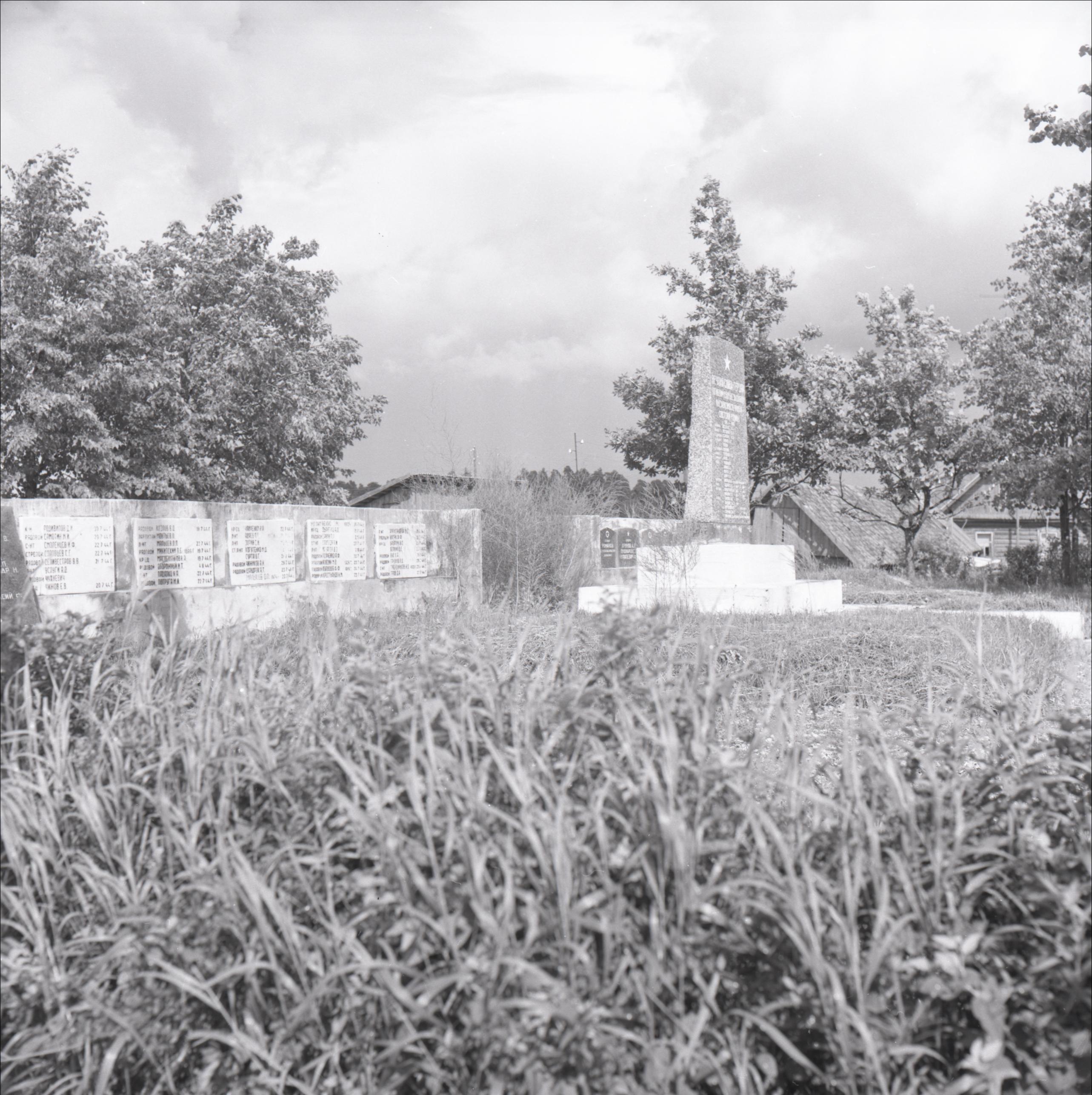 2. pasaules karā kritušo kapi Vecslabodas centrā: Piemineklis uz paaugstinajuma, aiz tā rindā uz betona mūra piestirpinātas piemiņas plāksnes