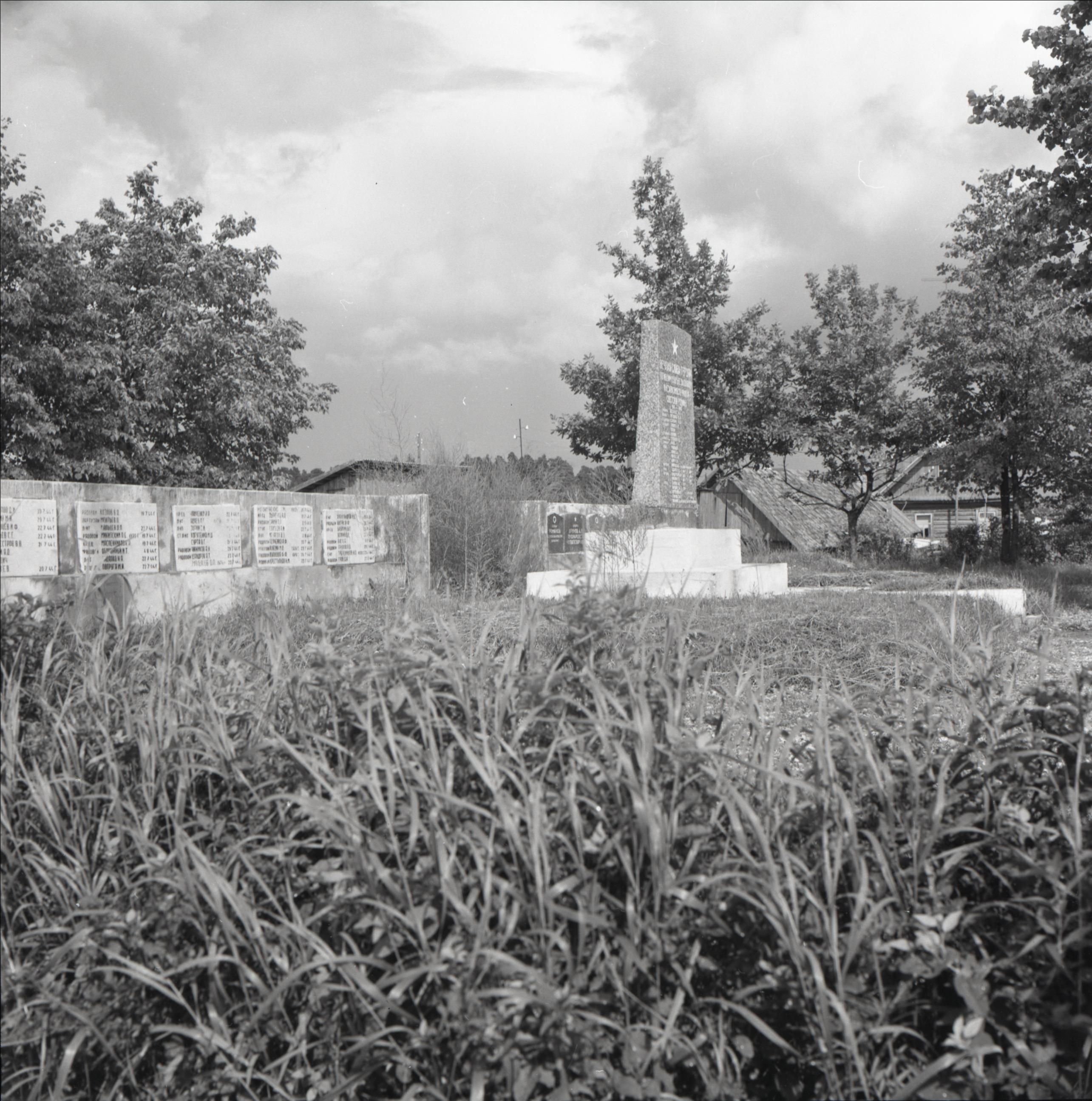 2. pasaules karā kritušo kapi Vecslabodas centrā: Piemineklis uz paaugstinajuma, aiz tā rindā uz betona mūra piestirpinātas piemiņas plāksnes