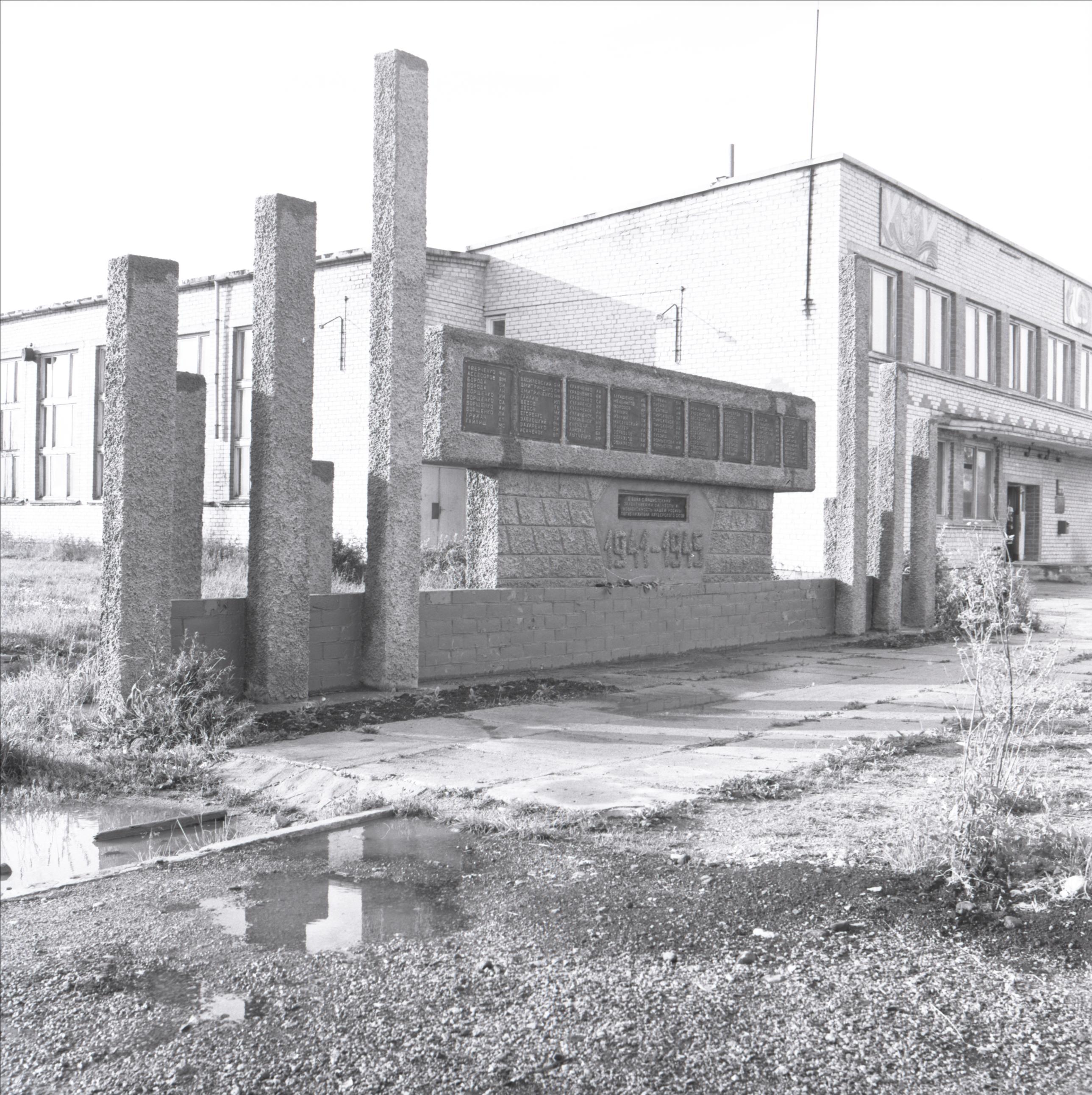 Piemineklis 2. Pasaules karā kritušajiem ciema iedzīvotājiem: Katrā pusē trīs stēlas, pa vidu mūris ar piemiņas plāksnēm, fonā divstāvu ēka