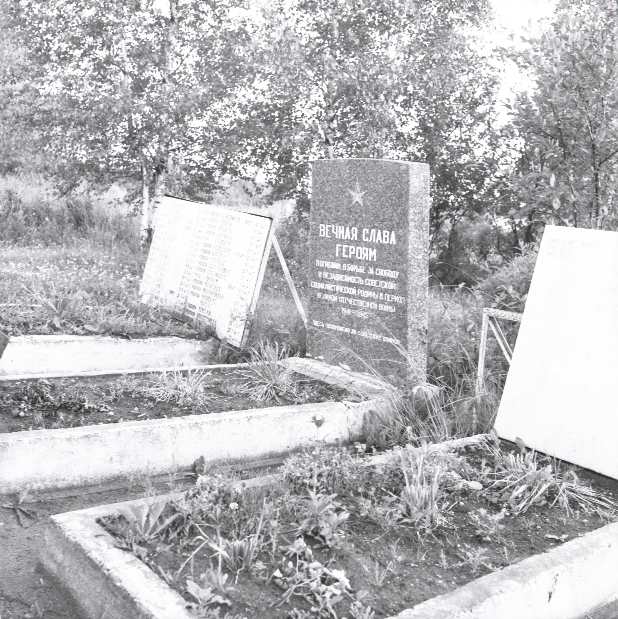 2. Pasaules karā kritušo kapi: Piemineklis ar uzrakstu "Mūžīga slava varoņiem" un zvaigzni, piemiņas plāksnes ar kritušo vārdiem, trīs kapa vietas