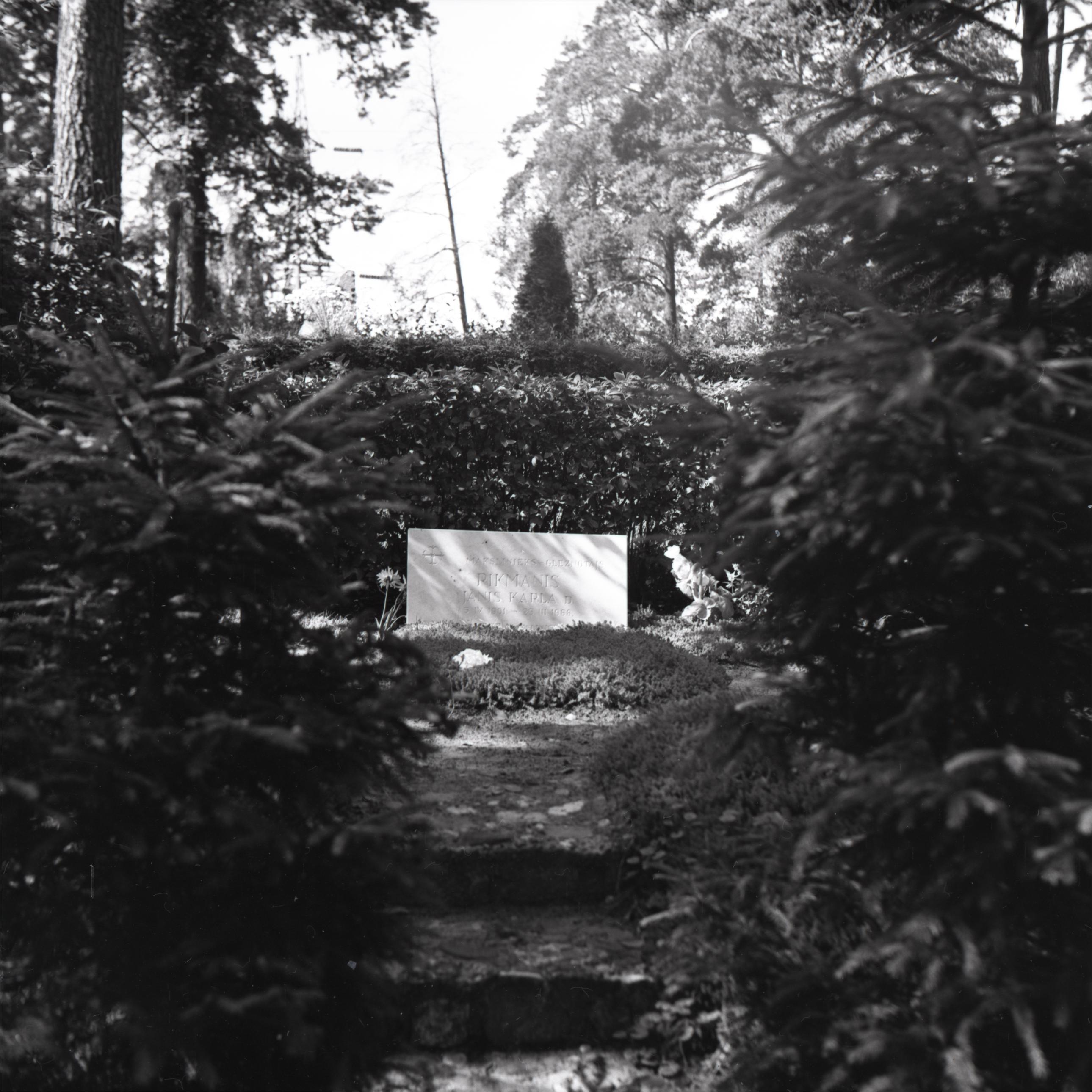 1. Meža kapi: Mākslinieka-gleznotāja Jāņa Rikmaņa kaps. Kapa piemineklis, kapa vieta, apstādījumi, koki