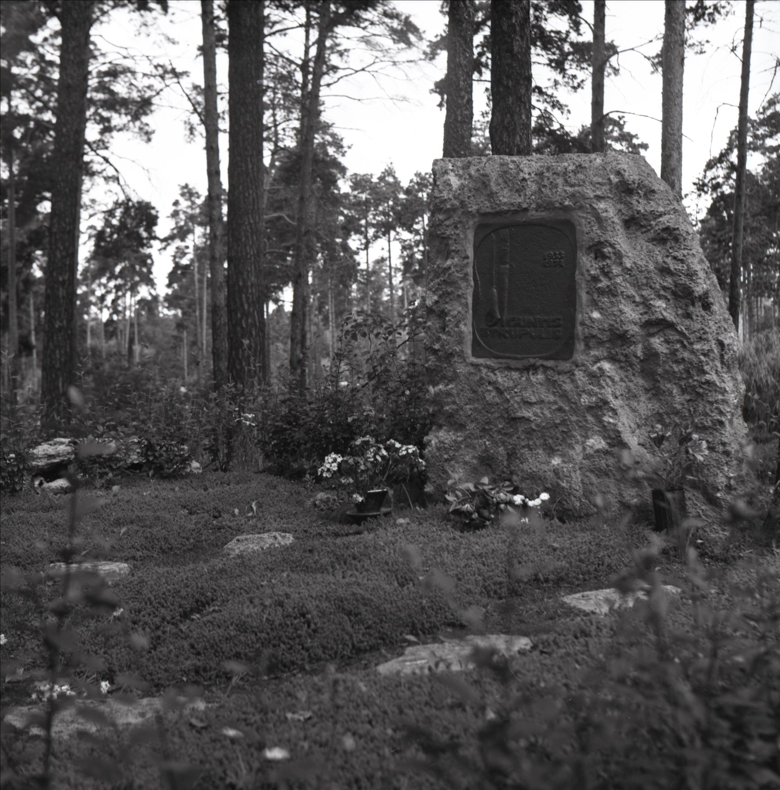 1. Meža kapi: Mākslinieka Gunta Strupuļa kaps. Kapakmens, tam vidū piemiņas plāksne ar gravējumiem, ziedi, apstādījumi