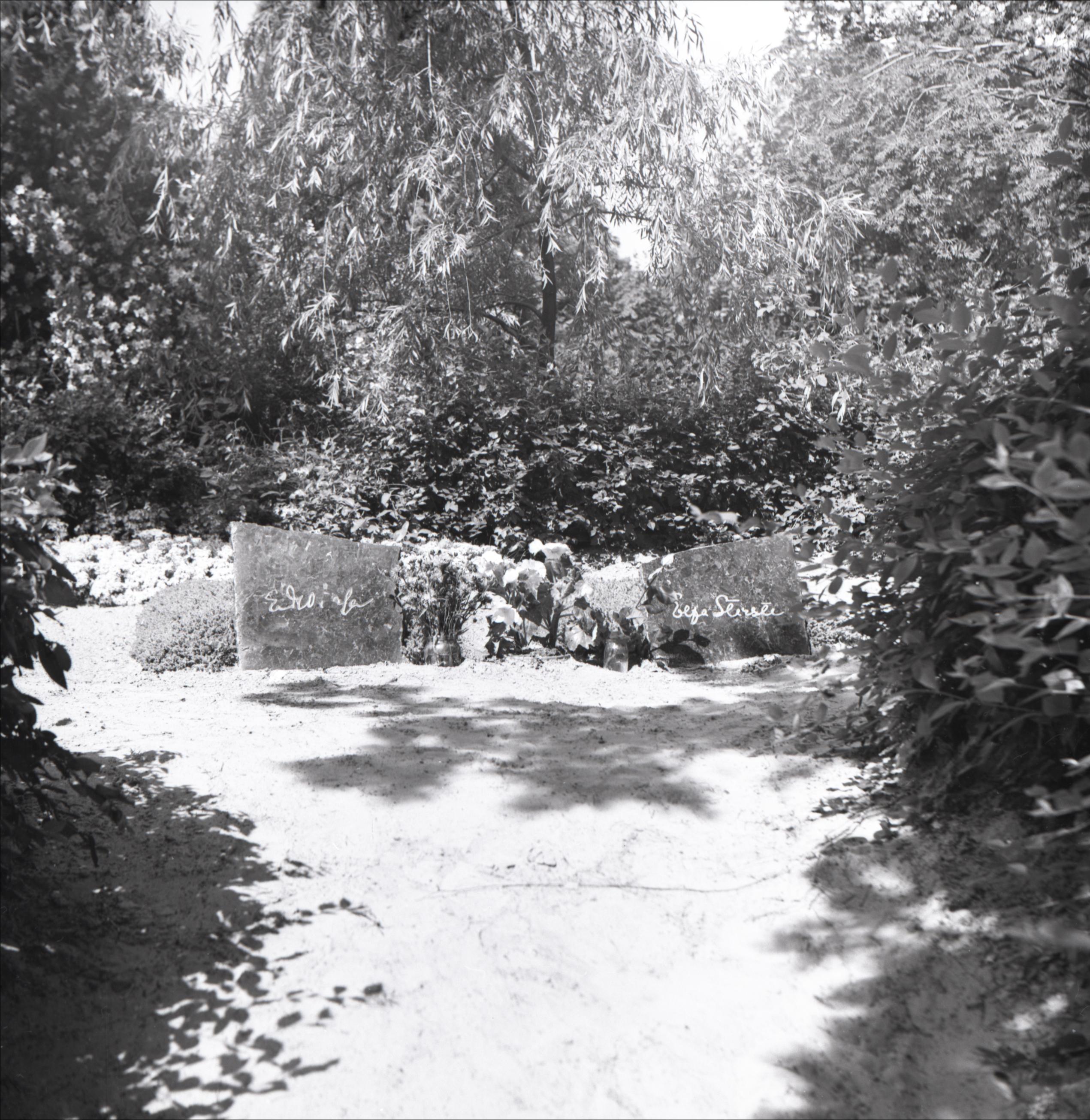 1. Meža kapi: Rakstnieces Elzas Stērstes kaps. Divi kapa pieminekļi, starp tiem ziedi, aiz tiem koki, krūmi