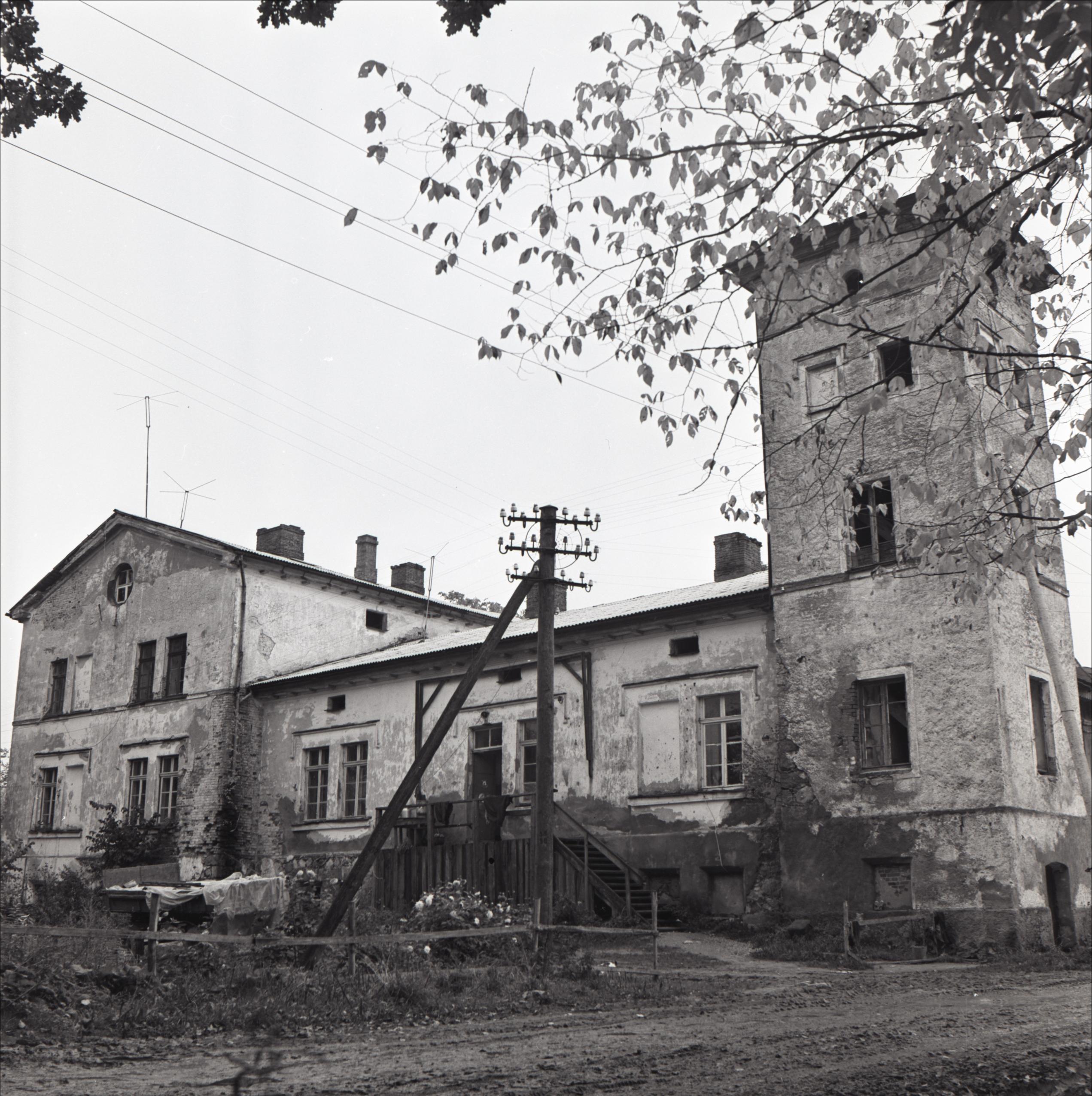 Nabes muižas apbūve: Nabes muižas kungu māja – fasāde, tornis, ieeja, dārzs, elektrības stabs, vadi