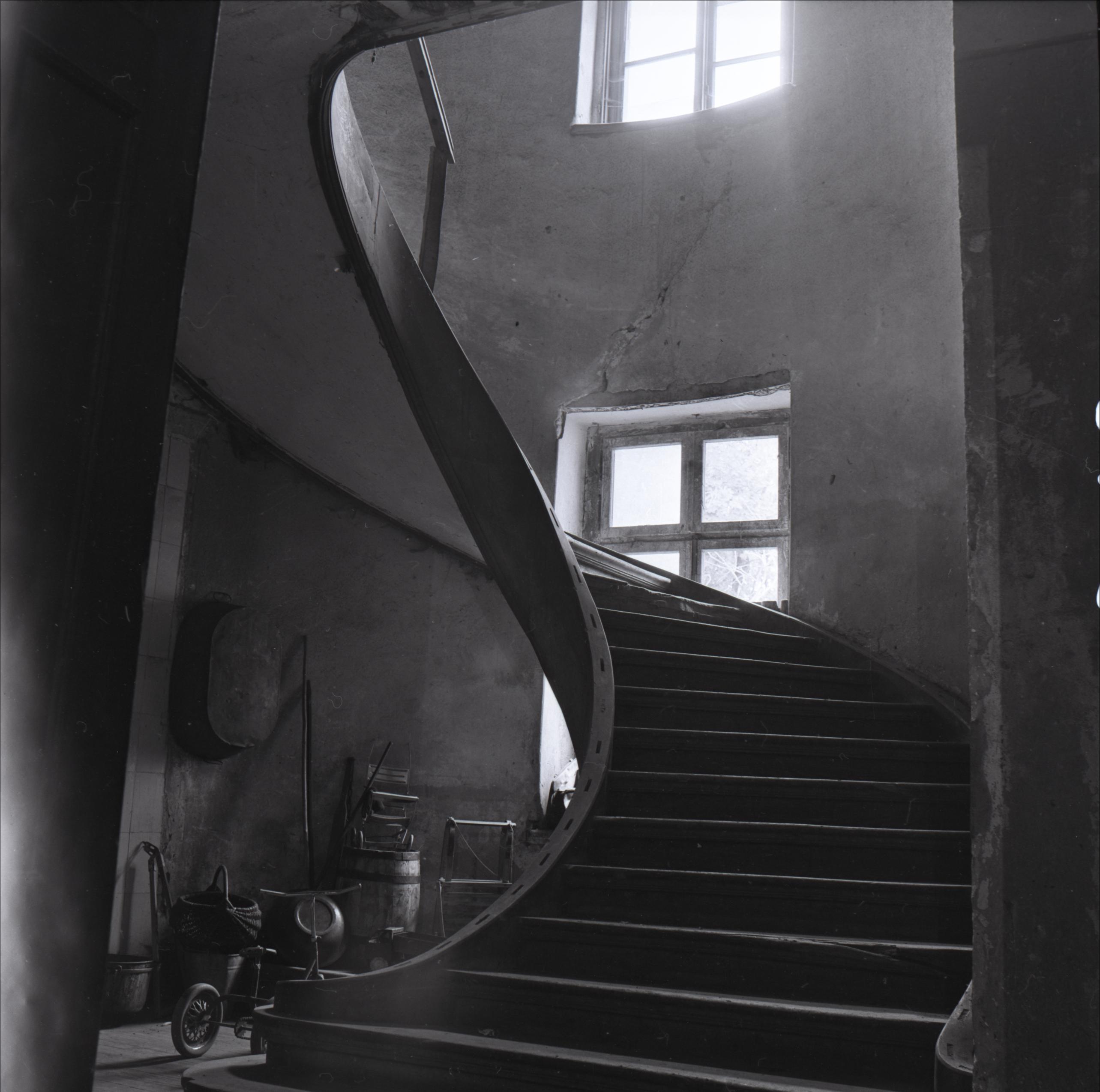 Nabes muižas apbūve: Nabes muižas kungu māja, kāpnes uz 2. stāvu, logi, zem kāpnēm priekšmetu glabātuve
