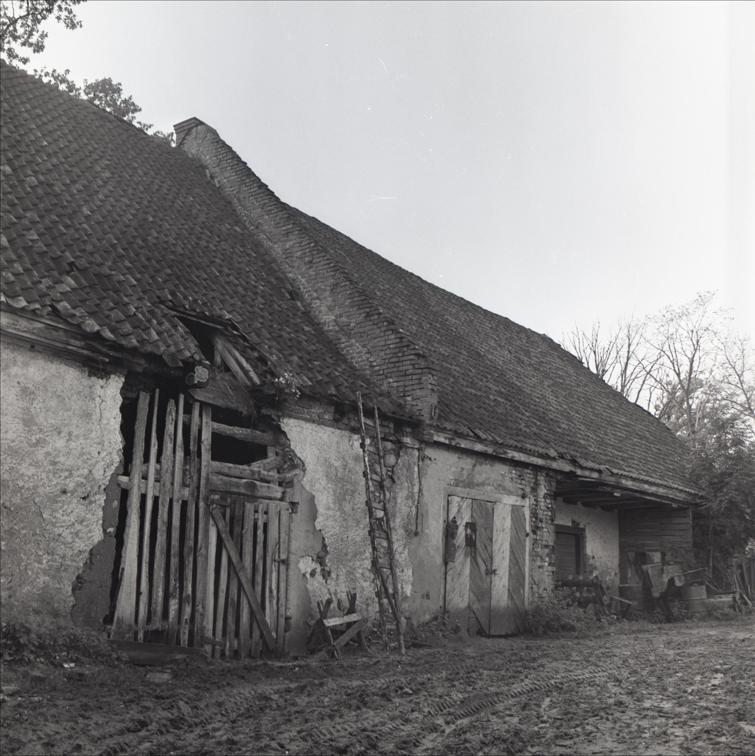 Nabes muižas apbūve: Vecā kūts – vārti, durvis, pret jumtu atbalstītas kāpnes, sienā ar dēļiem aizsists caurums