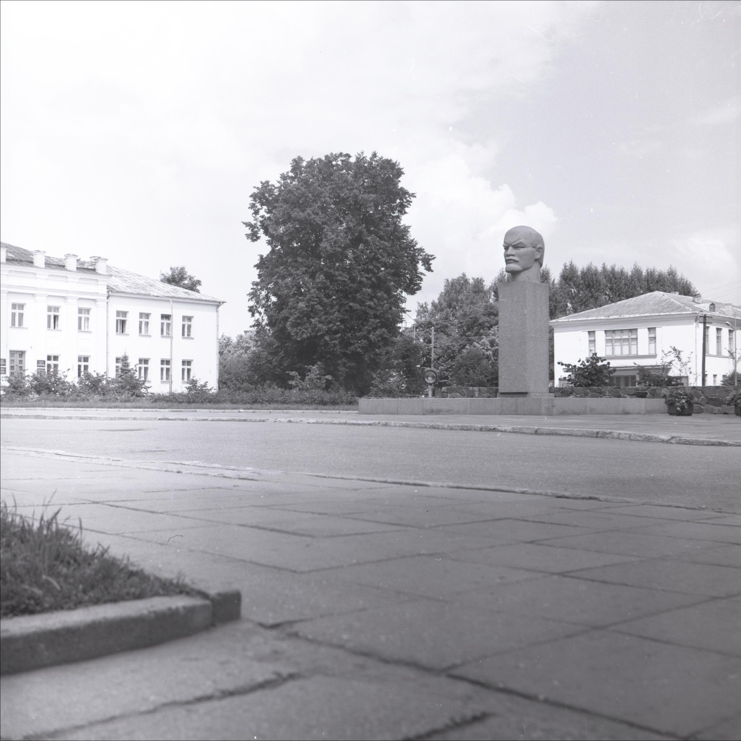Ļeņina piemineklis: Centrā piemineklis – galva uz postamenta, fonā divstāvu ēka un Dobeles novada pašvaldības ēka, koki. Redzama Brīvības iela