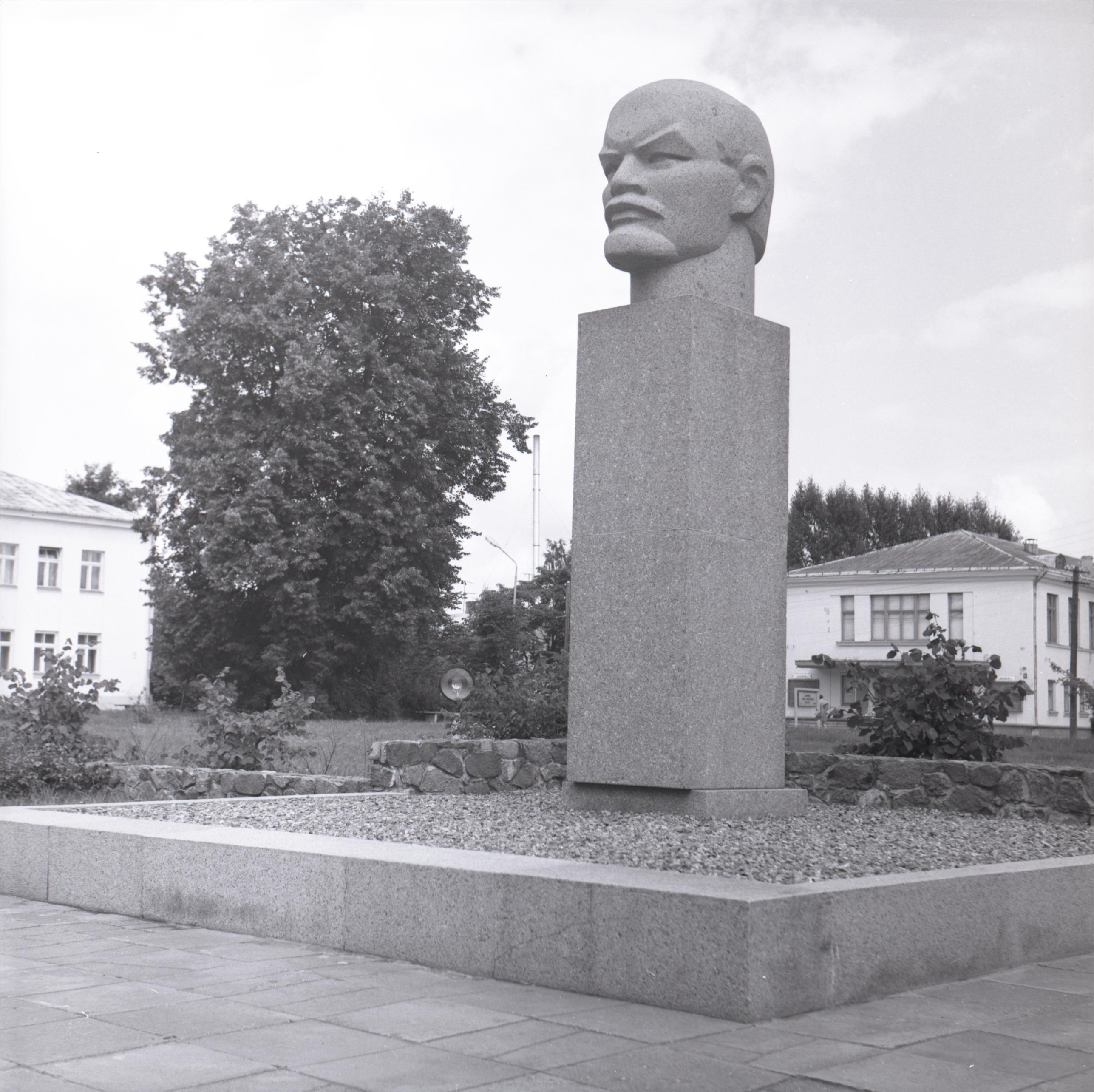 Ļeņina piemineklis: Tuvplāns. Centrā piemineklis – galva uz postamenta, fonā divstāvu ēka un Dobeles novada pašvaldības ēka, koki, krūmi