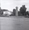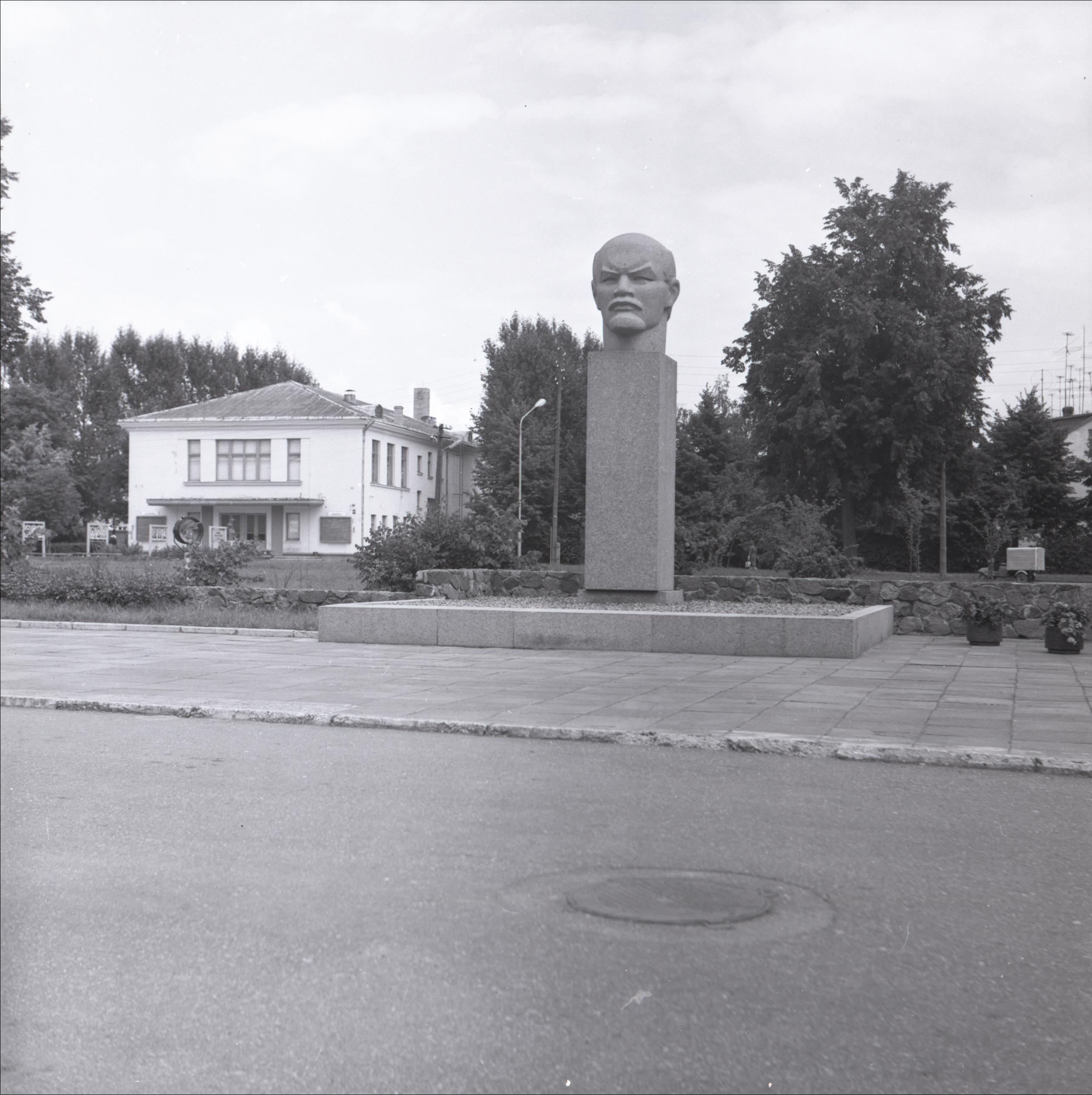 Ļeņina piemineklis: Centrā piemineklis – galva uz postamenta, fonā divstāvu ēka, koki, krūmi. Redzama Brīvības iela