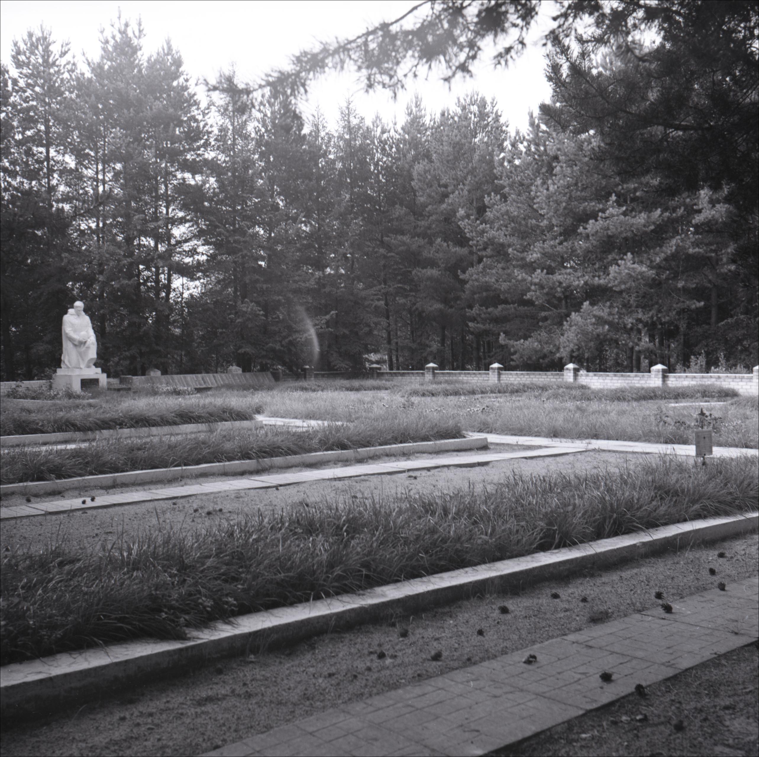 2. Pasaules kara Tīlaišu brāļu kapi: Piemineklis – karavīrs nokritis uz viena ceļa, noviltku cepuri, apkārt piemineklim piemiņas plāksnes, kapa vietas rindās