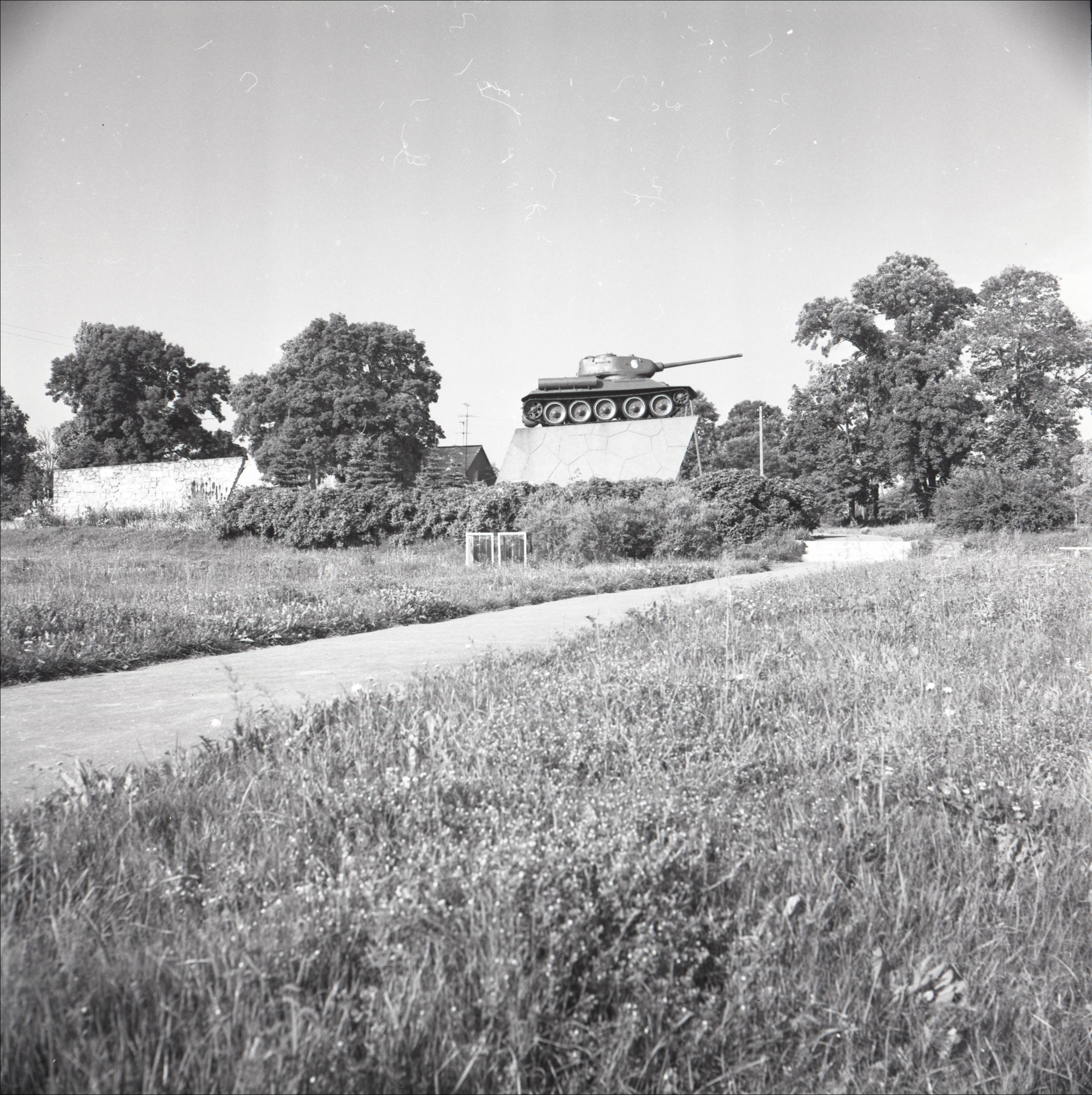 Piemineklis – tanks: Tanks uz postamenta, apkārt krūmi, ceļš, fonā koki, mūris, ēka