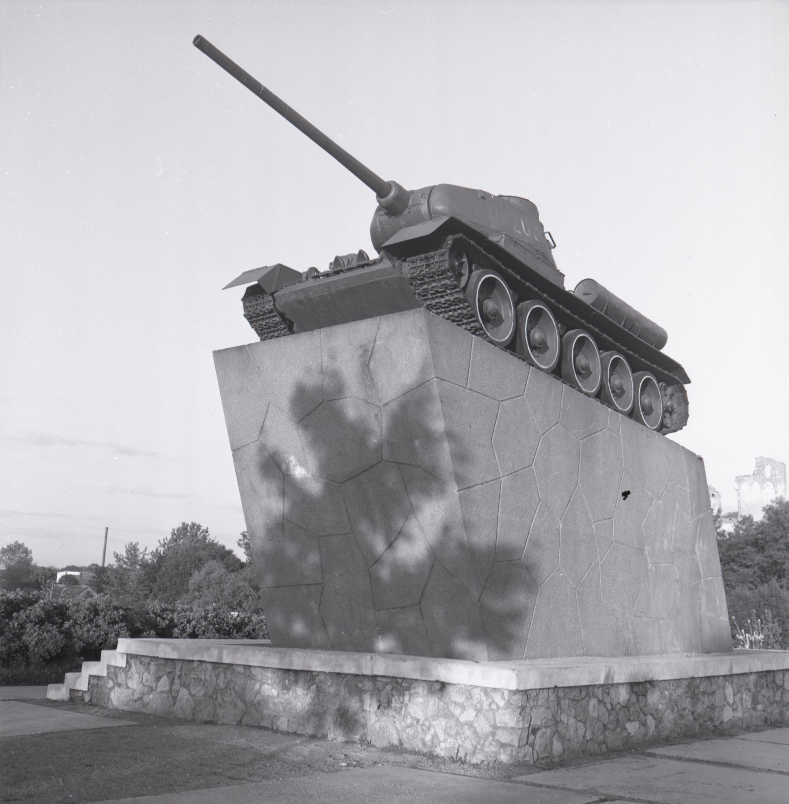 Piemineklis - tanks: Tanks uz postamenta, pakāpieni, apkārt krūmi, fonā koki un pilsdrupas