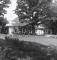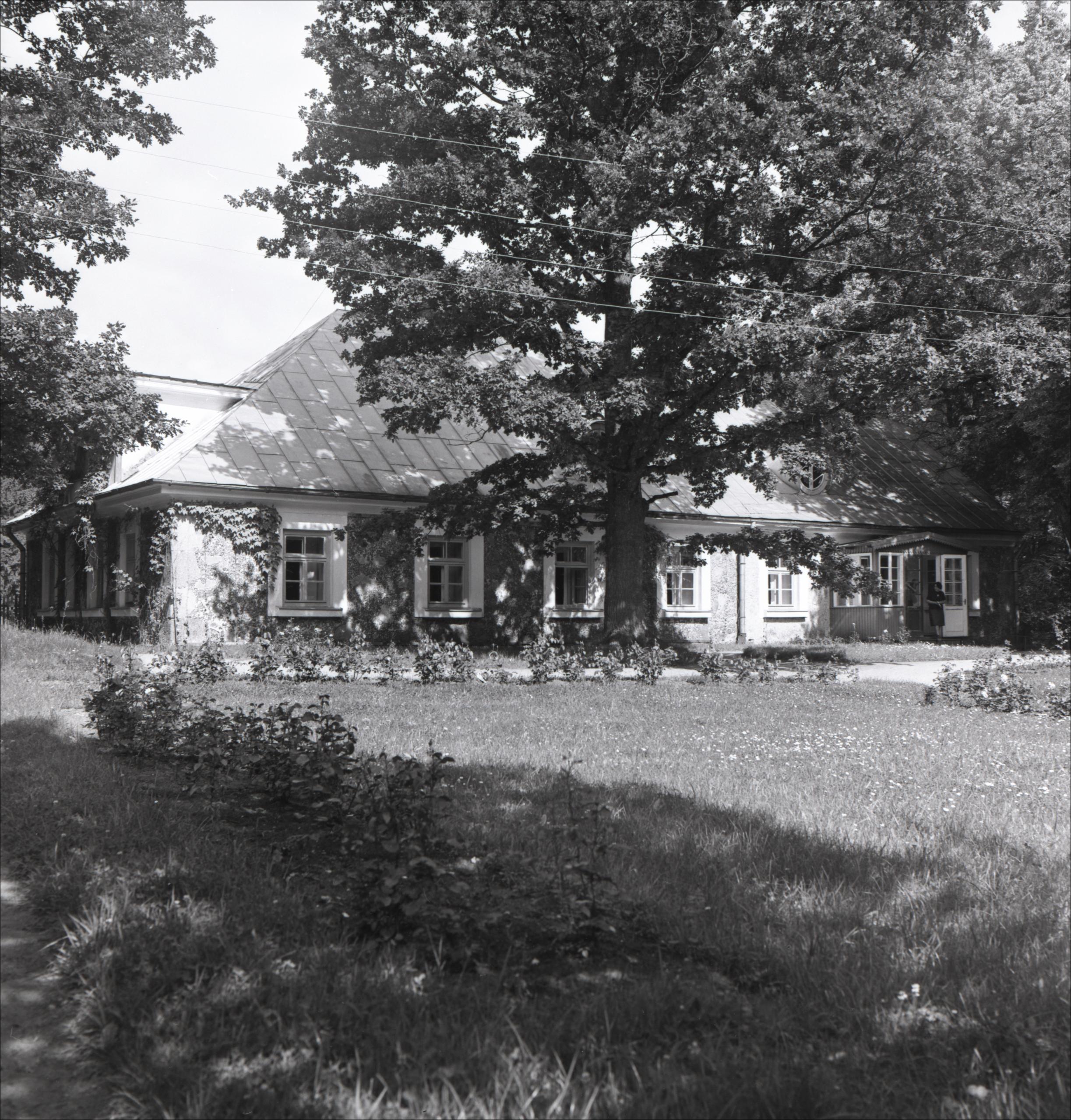 Rakstnieces A.Brigaderes dzīves vieta: Fasāde, ieeja, pie ārdurvīm cilvēks, koki