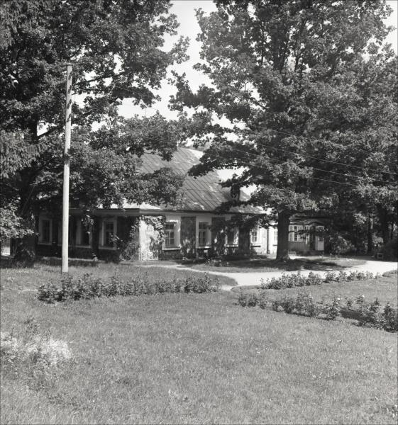 Rakstnieces A.Brigaderes dzīves vieta: Fasāde, ieeja, pie ārdurvīm cilvēks, koki, celiņi, apstādījumi
