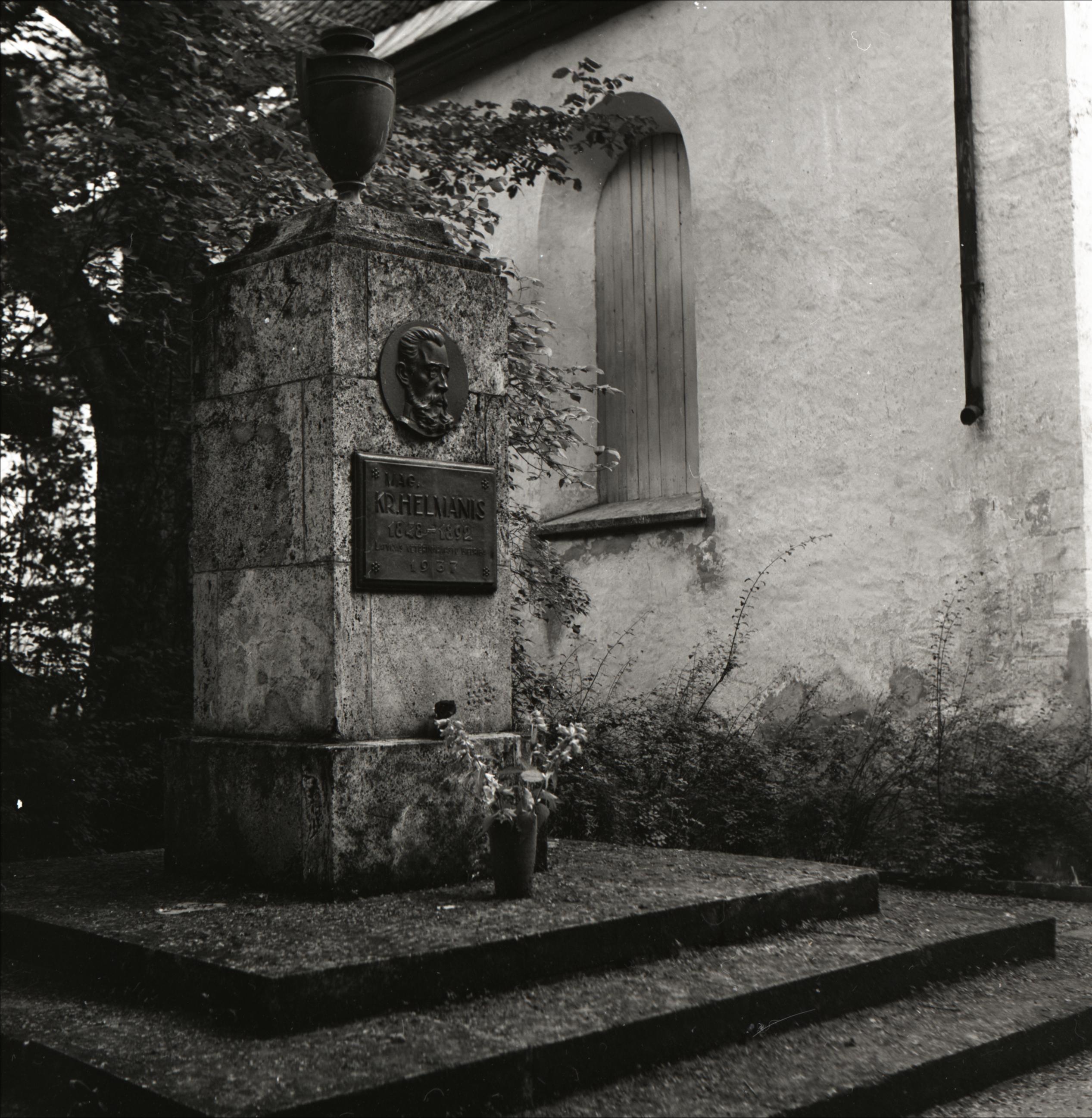 Kristapa Helmaņa kaps: Piemineklis, tā augšā urna, vidū Helmaņa portrets un piemiņas plāksne